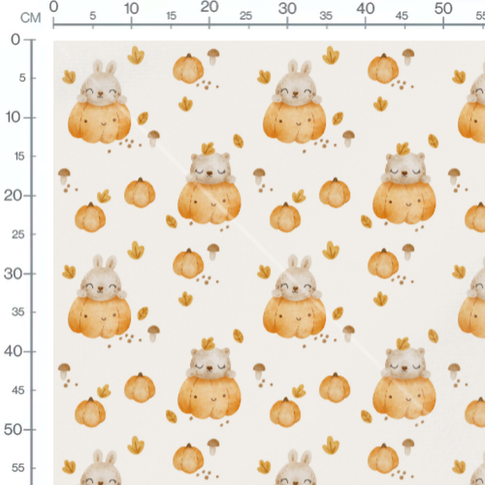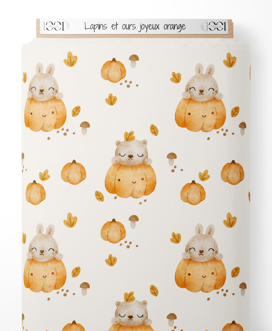 Les lapins et ours sont dessinés avec des expressions joyeuses. Les citrouilles sont d'un orange doux. Les champignons sont petits et de couleur marron clair. Les feuilles ajoutent une touche automnale au motif.Les tissus