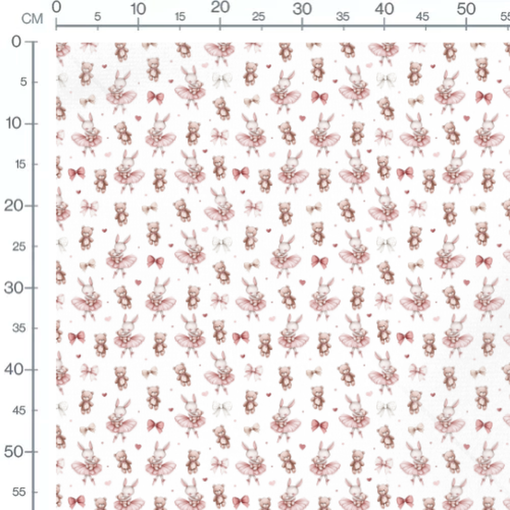 Les lapins portent des tutus roses et dansent gracieusement. Les oursons sont assis et souriants. Des nœuds et des cœurs ajoutent une touche de douceur au motif.Les tissus