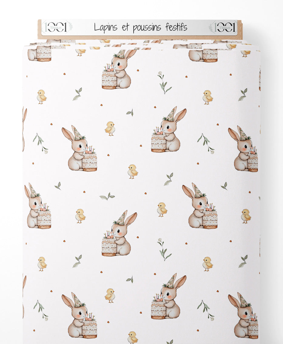 Les lapins portent des chapeaux de fête et tiennent des gâteaux décorés de bougies. Les poussins jaunes ajoutent une touche joyeuse au motif, accompagnés de petites feuilles vertes dispersées.Les tissus