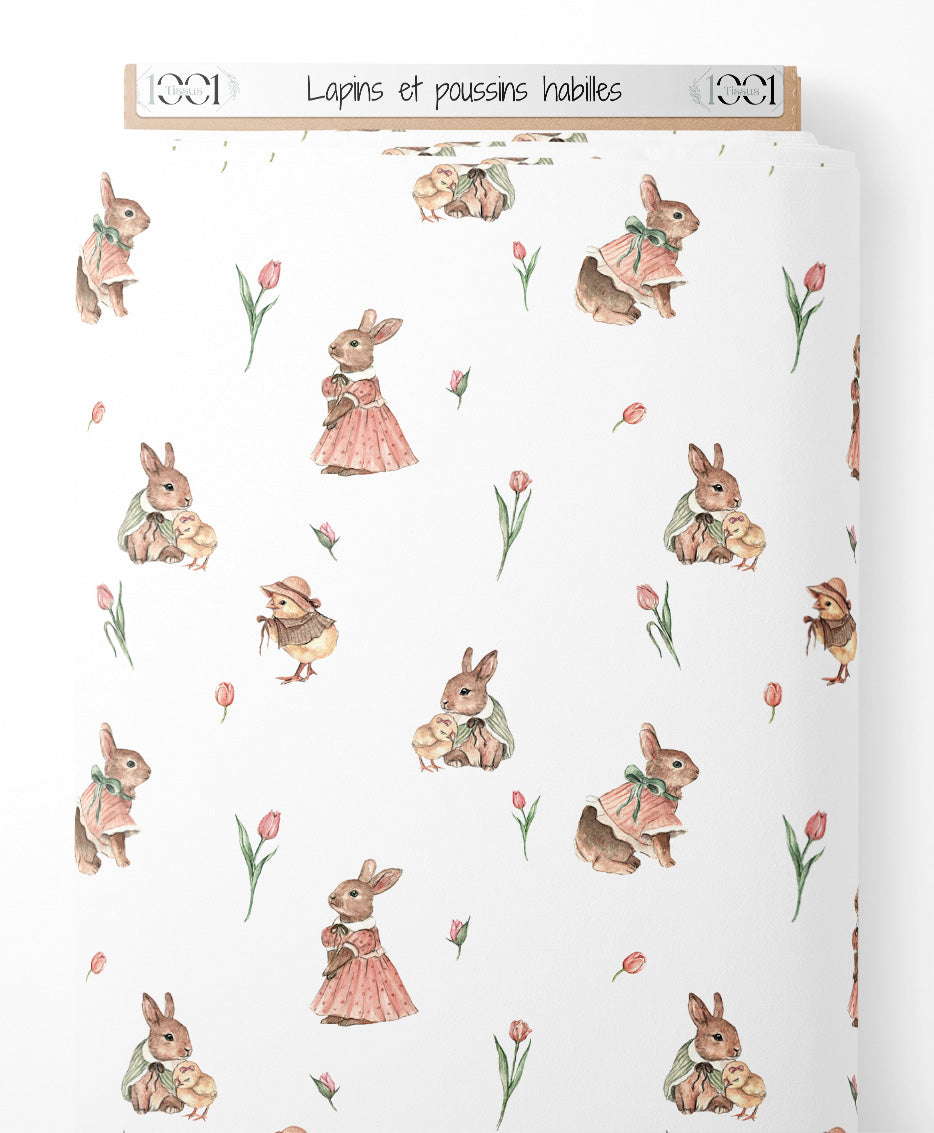 Les lapins portent des vêtements élégants dans des tons pastel. Les poussins sont également habillés avec des accessoires mignons. Les tulipes ajoutent une touche florale au motif.Les tissus