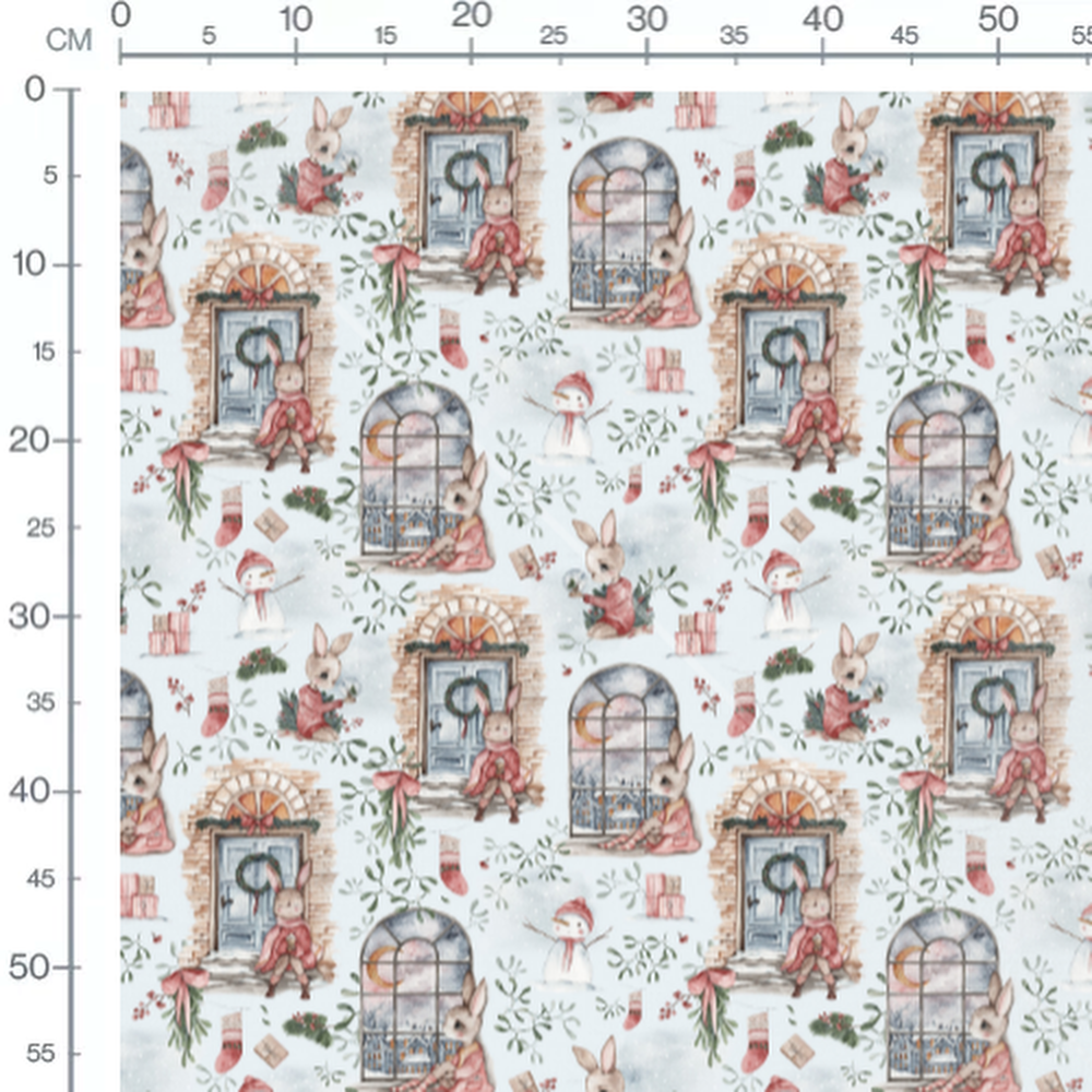 Des chaussettes de Noël et des cadeaux sont dispersés autour des lapins. Les fenêtres montrent un paysage enneigé avec des détails festifs. Les branches de houx ajoutent une touche de verdure au motif.Les tissus