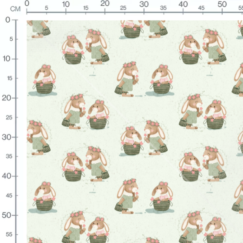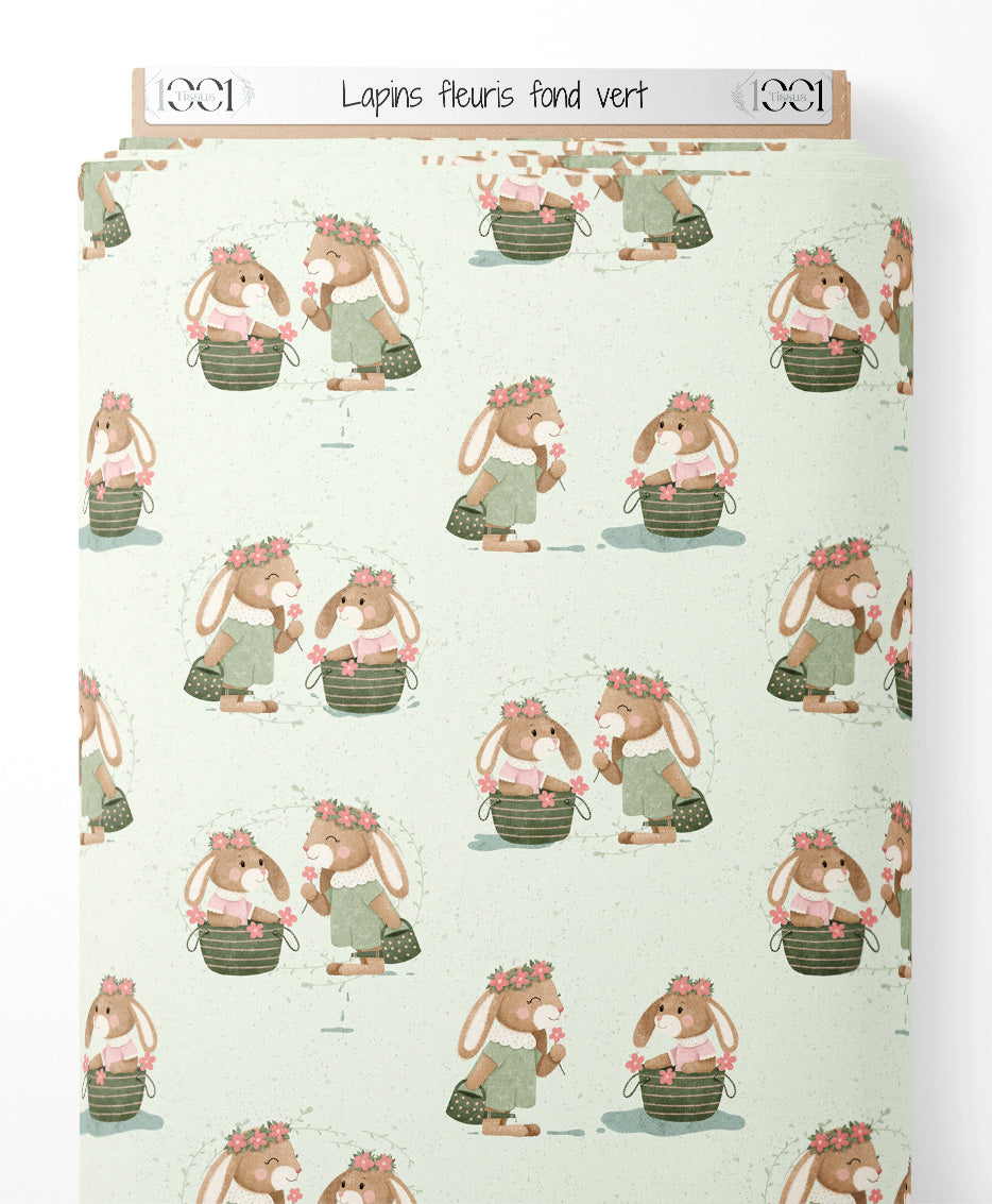 Les lapins portent des vêtements verts et des couronnes de fleurs roses. Ils sont assis dans des paniers décorés de fleurs. Le fond est d'un vert pâle doux.Les tissus