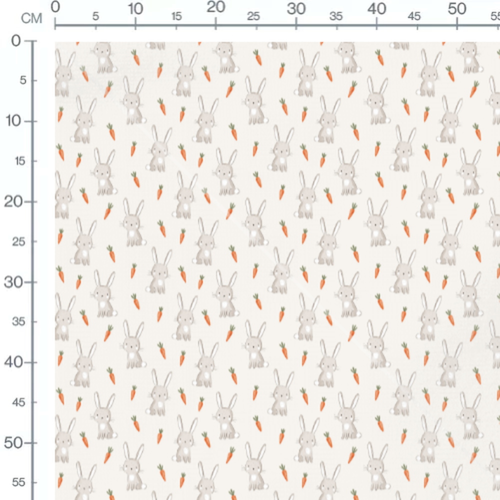 Les carottes sont dessinées avec des fanes vertes. Les lapins ont des détails délicats et un aspect doux.Les tissus