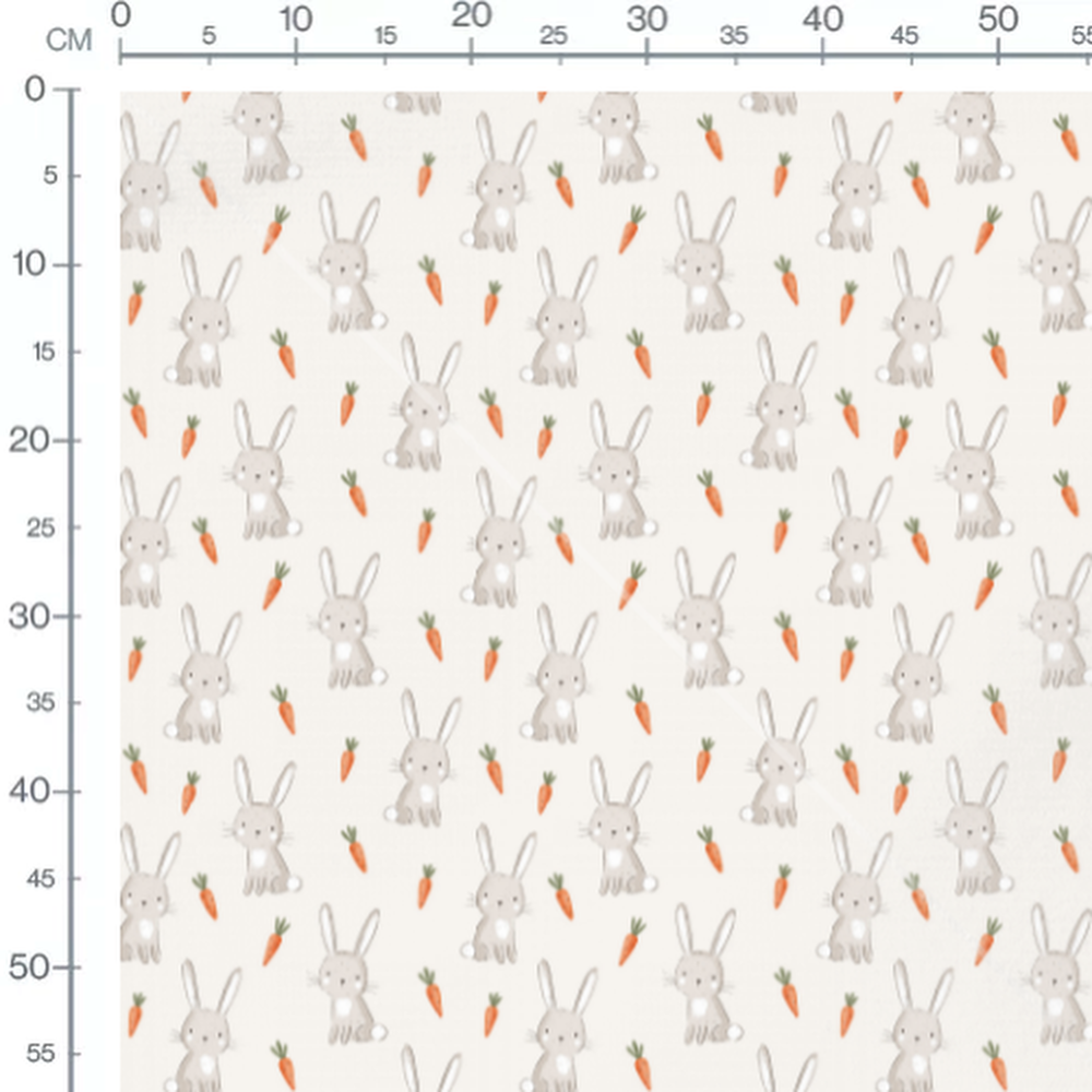 Les lapins ont des expressions douces et des détails délicats. Les carottes sont dispersées entre les lapins, ajoutant une touche de couleur vive. Le fond beige met en valeur les motifs de manière subtile.Les tissus
