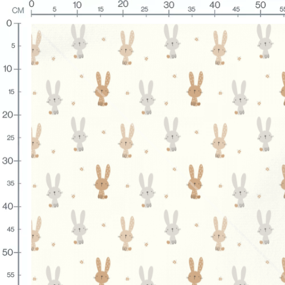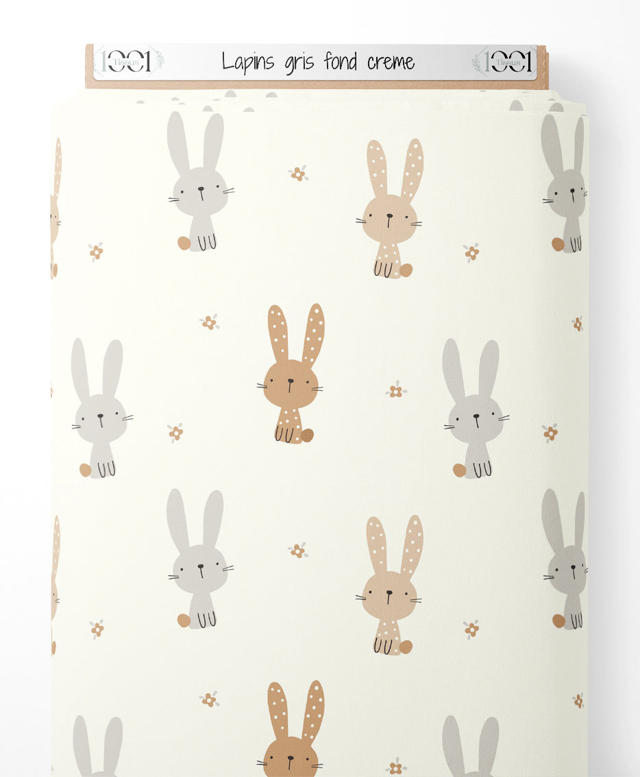 Les lapins ont des oreilles longues et des expressions simples. Les fleurs ajoutent une touche délicate au motif.Les tissus