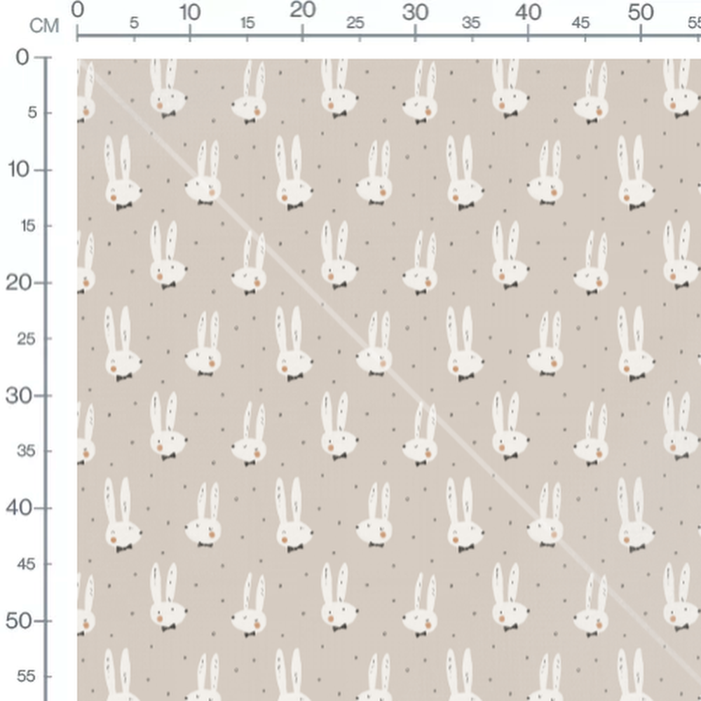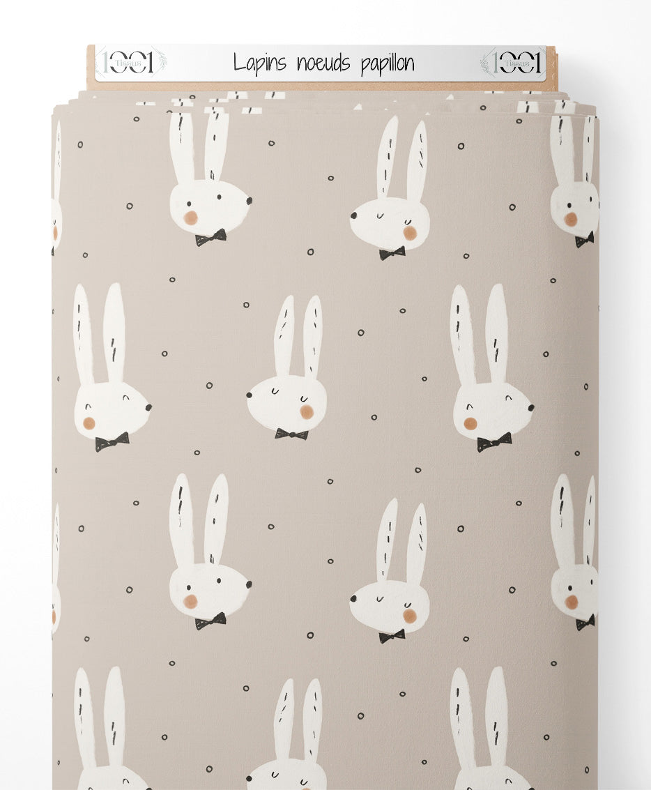Les lapins ont des joues roses et des oreilles longues. Les nœuds papillon ajoutent une touche élégante. Le fond beige est parsemé de petits cercles noirs.Les tissus
