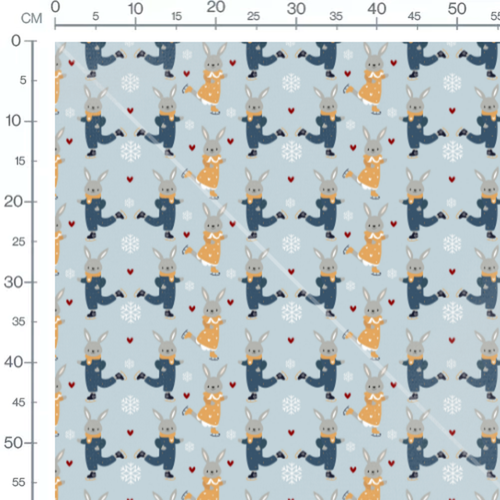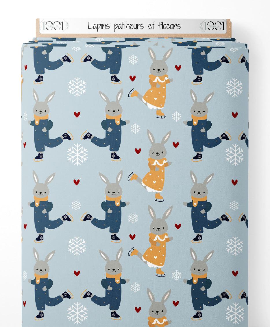 Les lapins portent des vêtements d'hiver bleus et orange. Les flocons de neige sont de différentes tailles. Les cœurs rouges ajoutent une touche de couleur vive.Les tissus