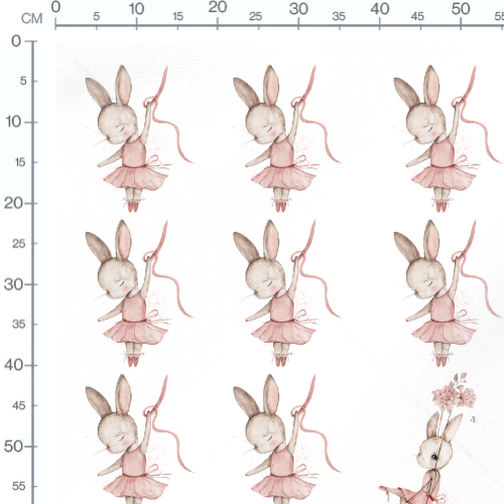 Les lapins portent des robes roses avec des détails floraux. Le fond noir met en valeur les couleurs douces des motifs. Les oreilles des lapins sont accentuées par des nuances de rose pâle.Les tissus