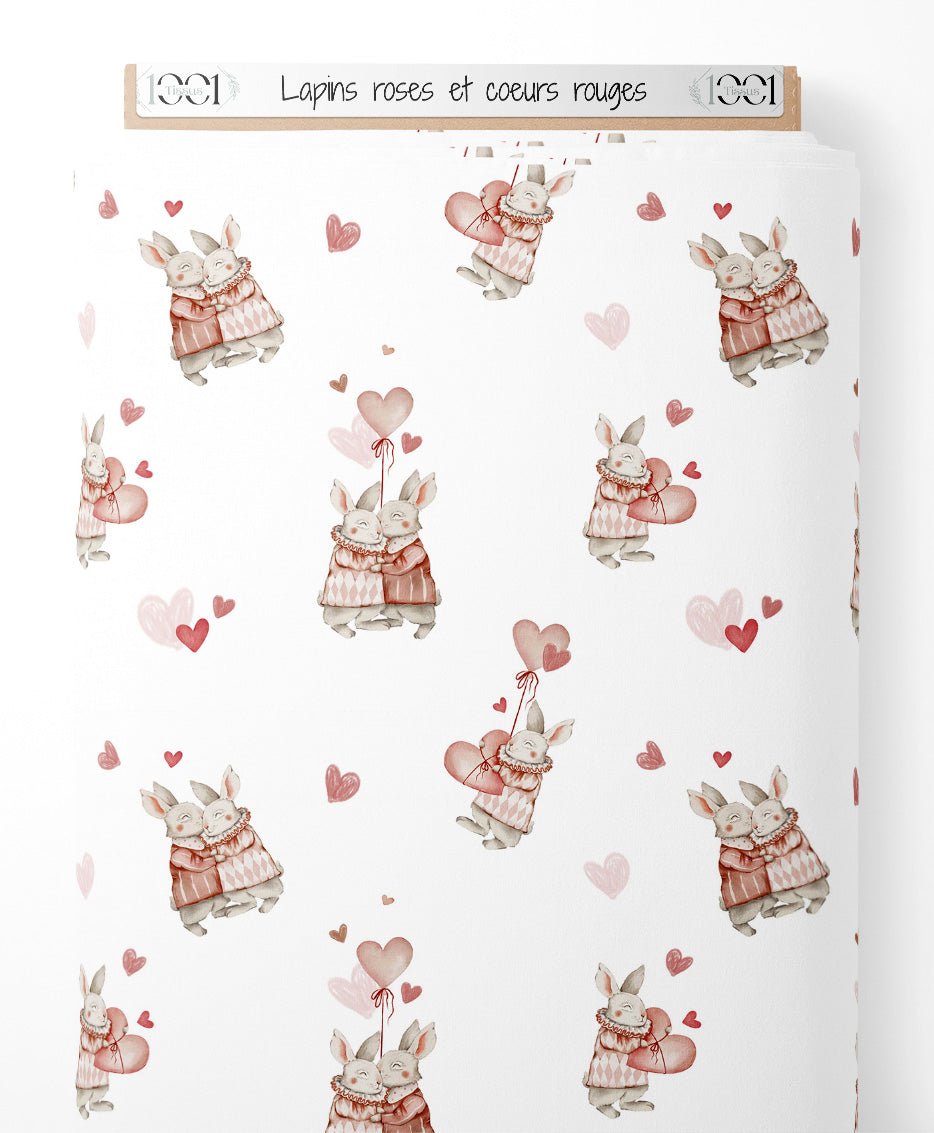 Les lapins portent des vêtements à motifs géométriques roses. Les cœurs et ballons ajoutent une touche romantique au motif.Les tissus