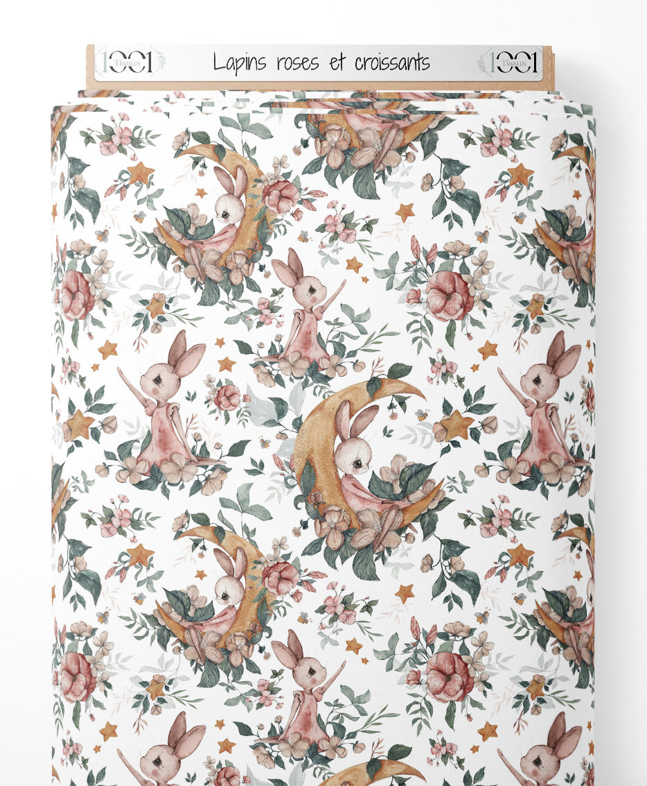 Les lapins sont assis sur des croissants de lune entourés de fleurs délicates. Les fleurs sont dans des tons de rose et de pêche. Des étoiles dorées ajoutent une touche magique au motif. Les feuillages verts apportent une fraîcheur naturelle.Les tissus