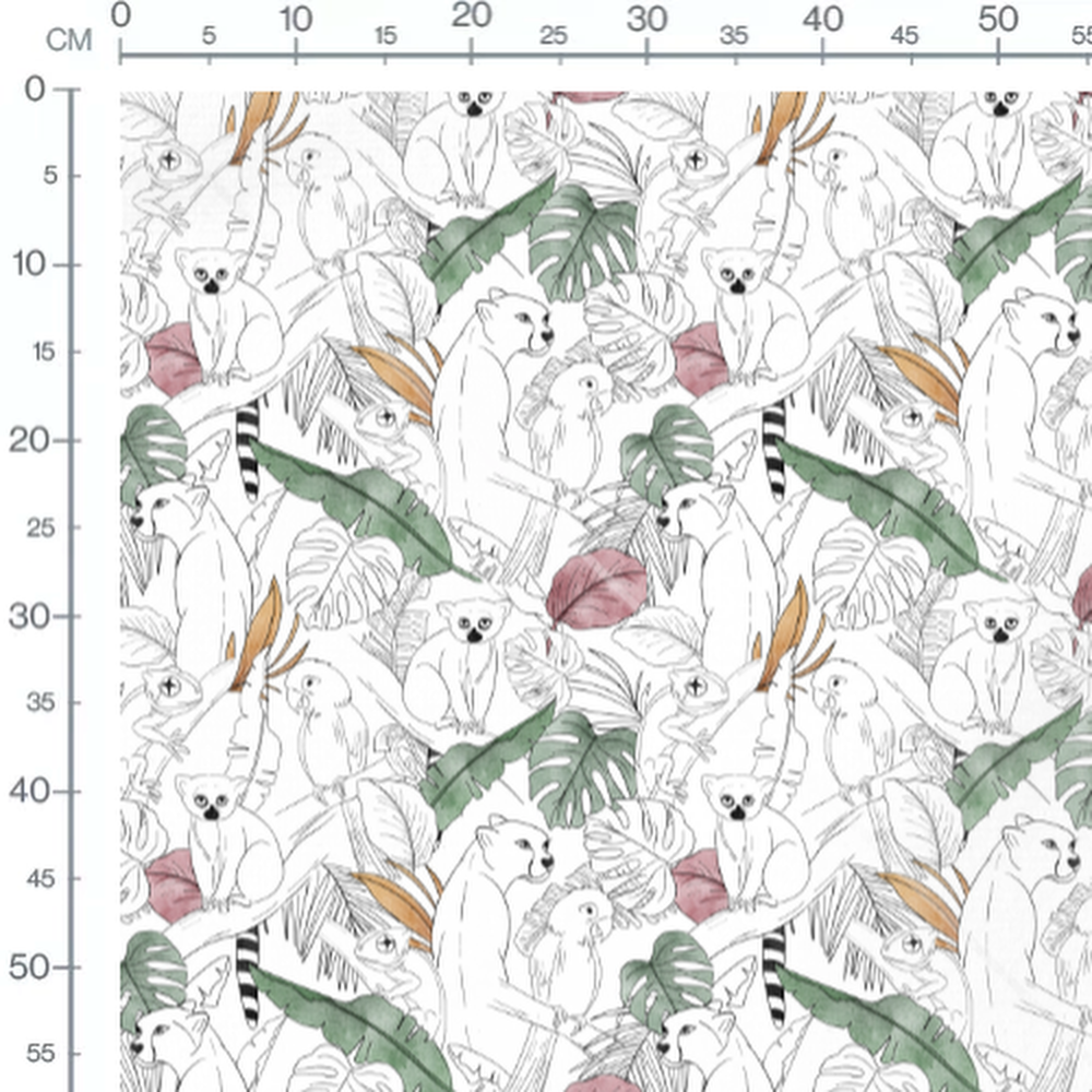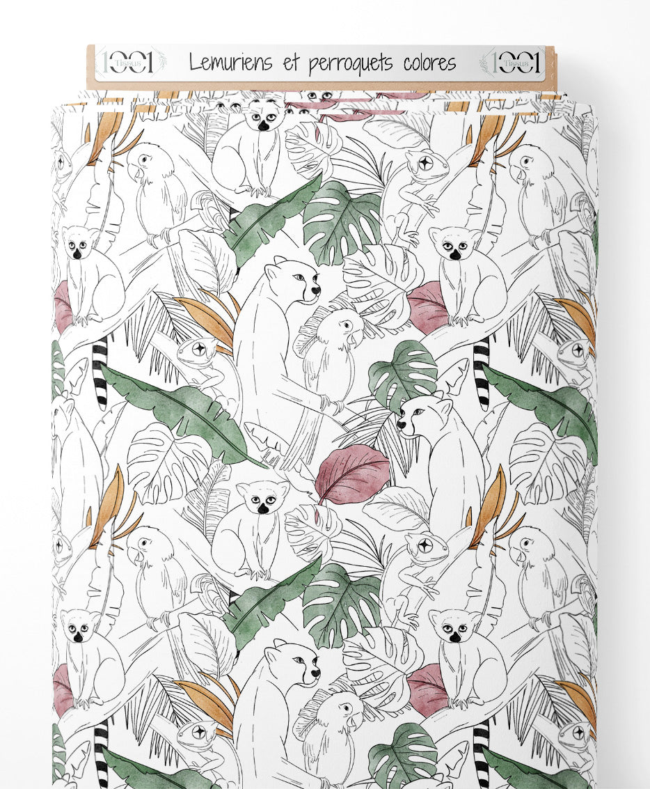 Les lémuriens sont assis parmi des feuilles de monstera et d'autres plantes tropicales. Les perroquets sont perchés sur des branches. Les feuilles sont dans des tons de vert et rouge, ajoutant une touche de couleur au dessin.Les tissus