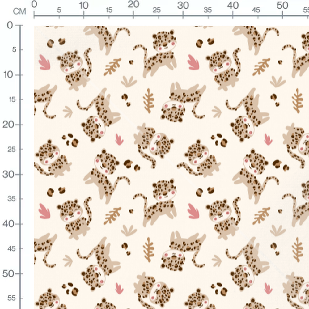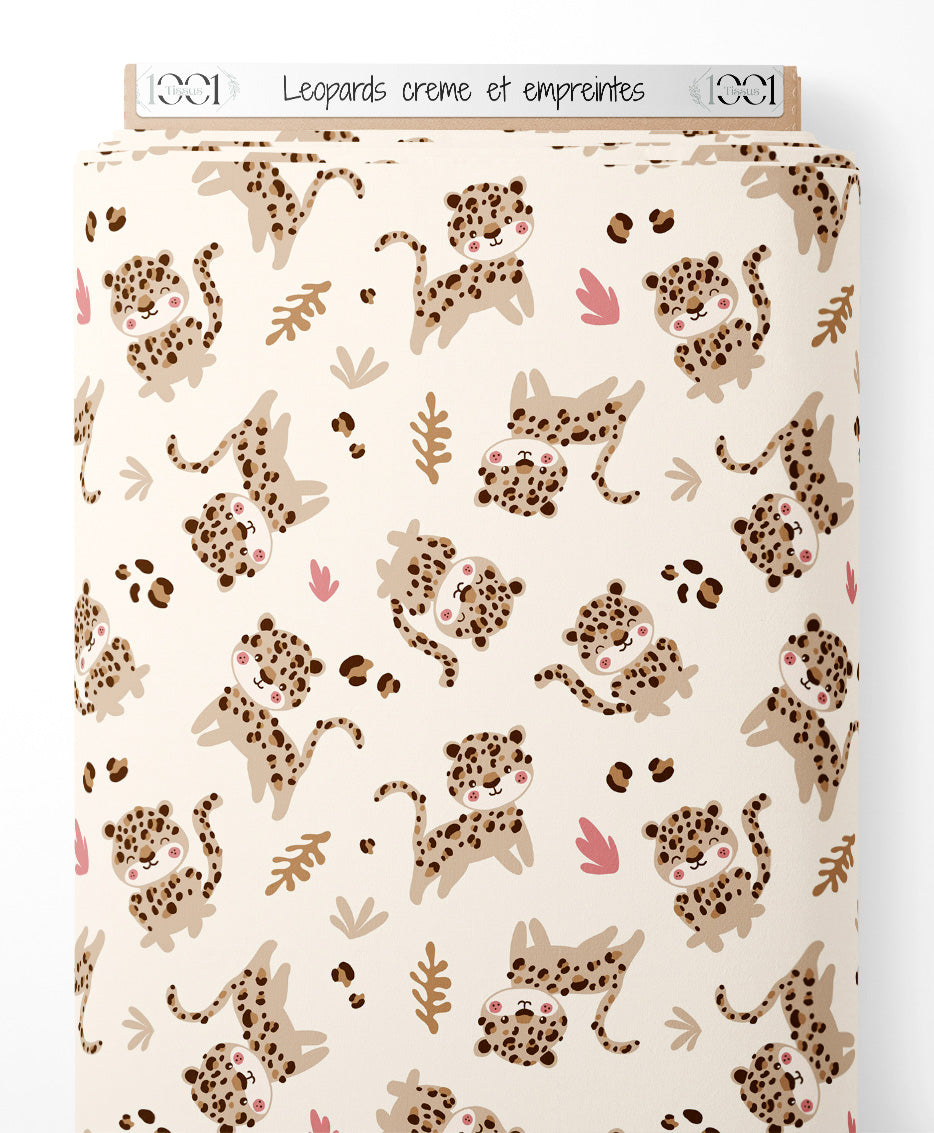Les léopards ont des joues roses et des expressions joyeuses. Les feuilles sont stylisées et de couleur marron et rose. Les empreintes ajoutent un détail ludique au motif.Les tissus