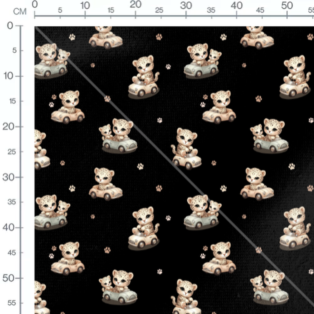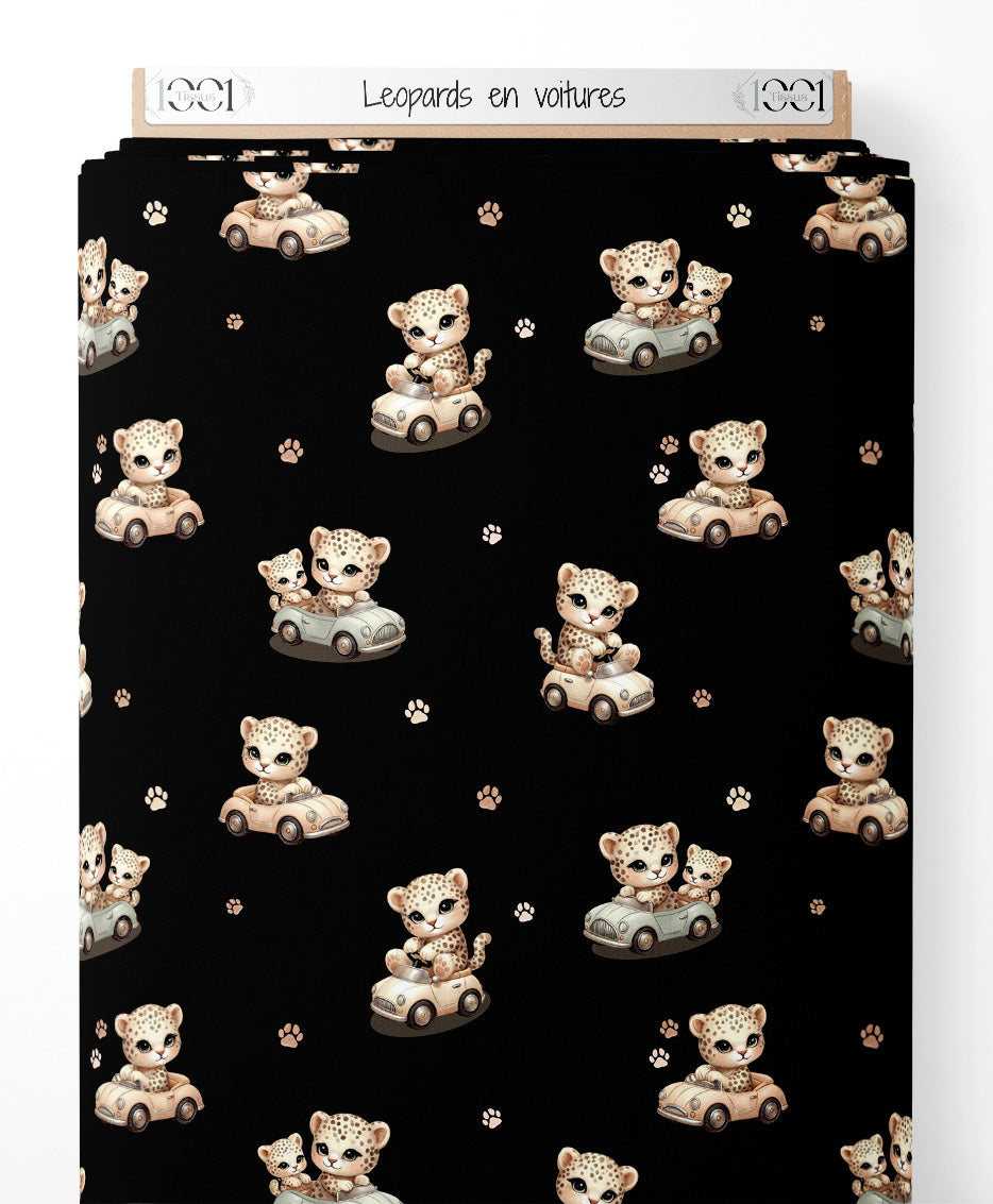 Les léopards sont assis dans des voitures grises. Les empreintes de pattes ajoutent un détail ludique au motif.Les tissus