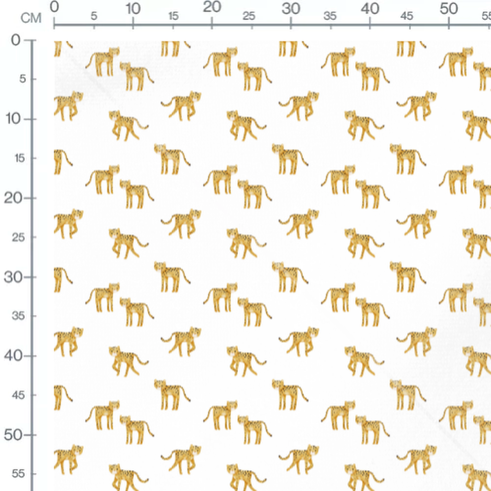 Les léopards ont des expressions faciales simplifiées et amicales. Leurs corps sont parsemés de petites taches noires uniformes. Le fond blanc met en valeur les couleurs vives des léopards.Les tissus