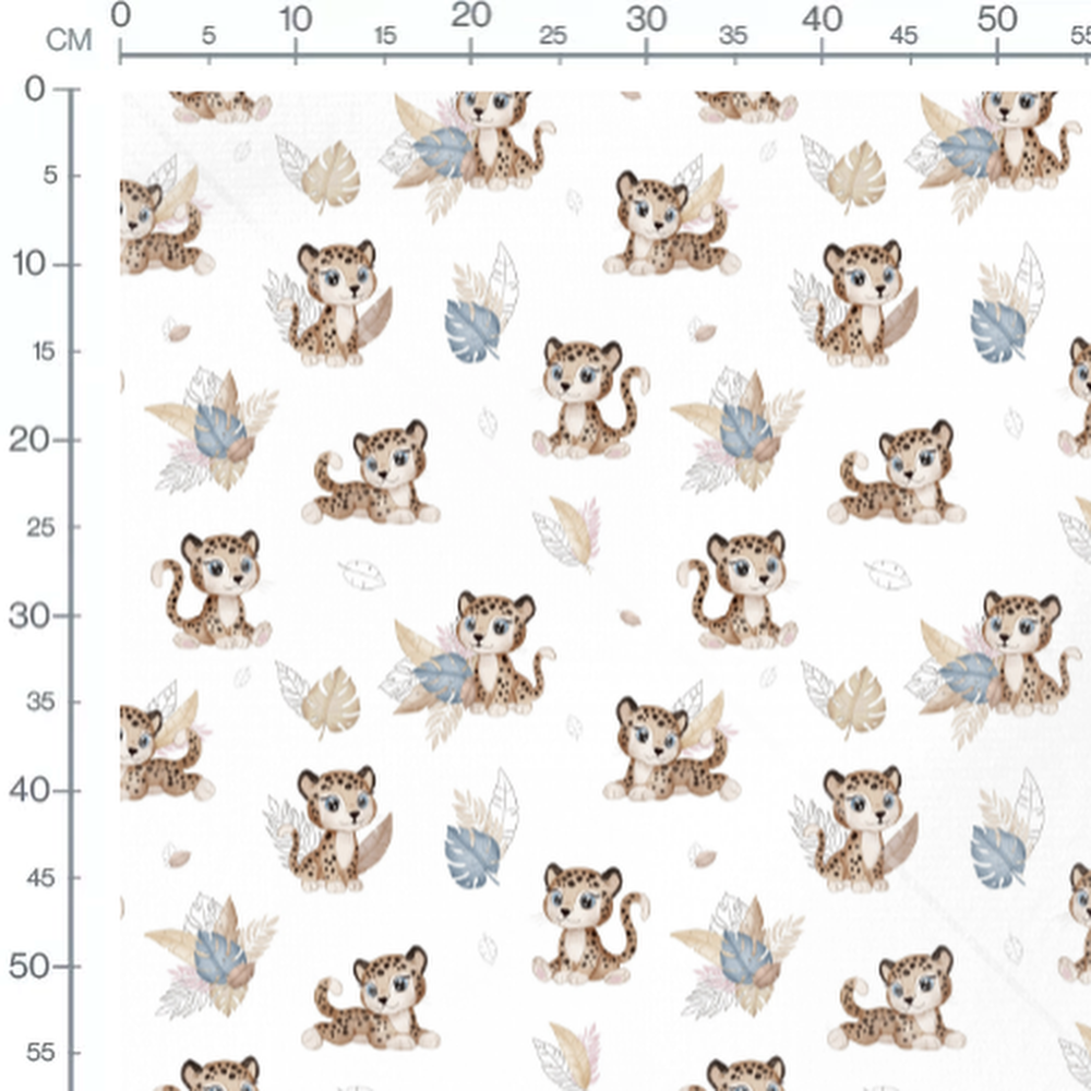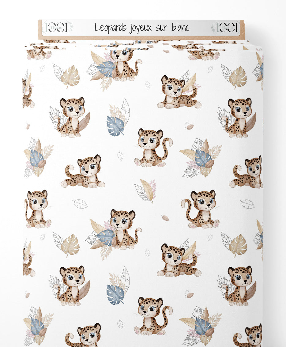 Les léopards ont des expressions joyeuses et des yeux bleus. Les feuilles sont de différentes formes et tailles, ajoutant une touche de nature. Les couleurs douces créent une ambiance apaisante.Les tissus