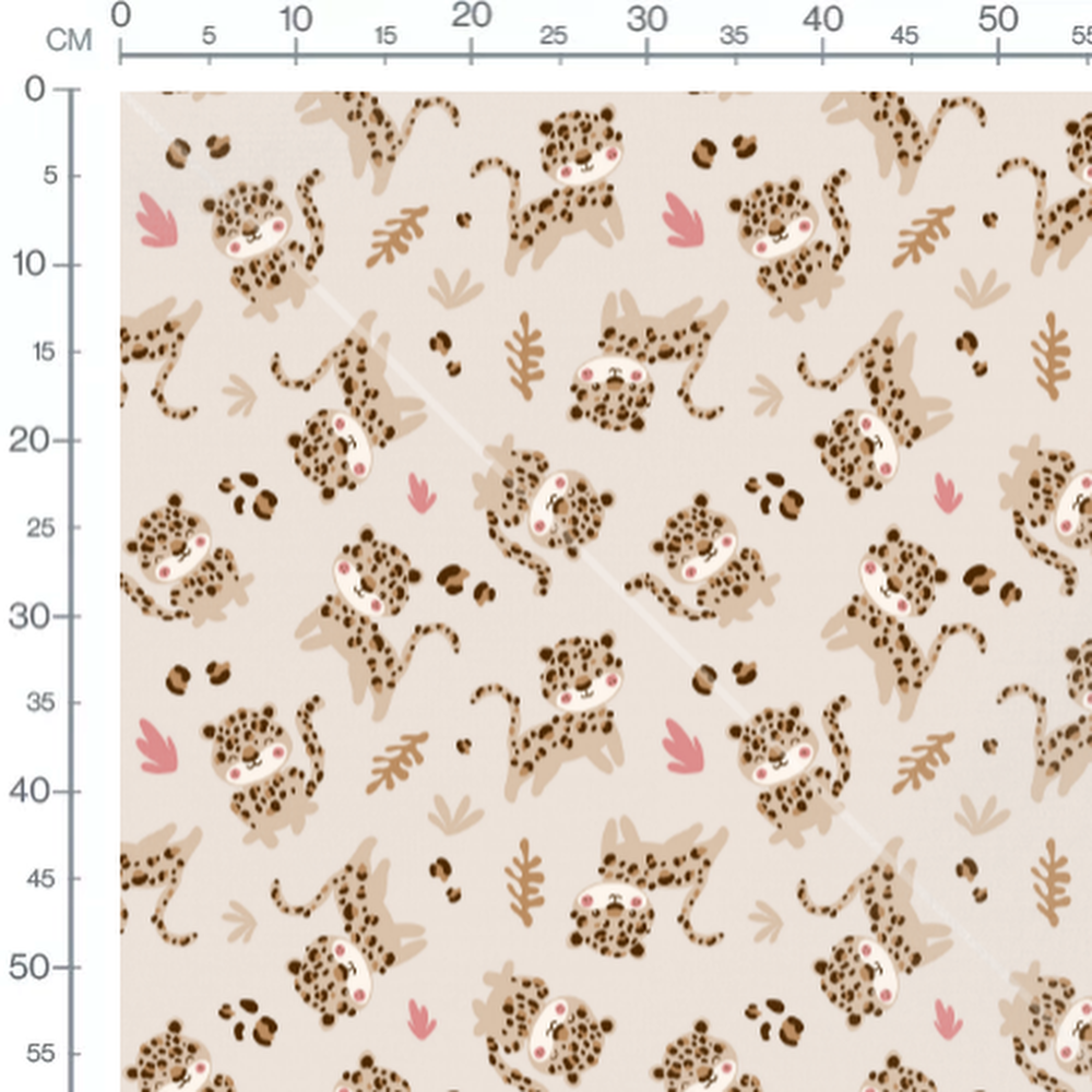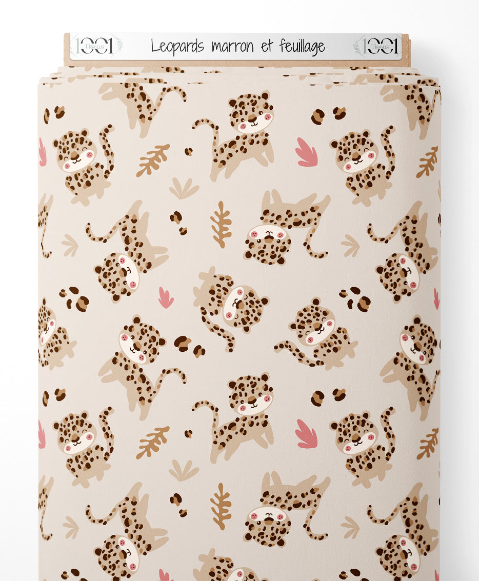 Les léopards ont des joues roses et des taches foncées. Les feuilles sont de différentes formes et teintes. Les empreintes ajoutent un détail ludique au motif.Les tissus