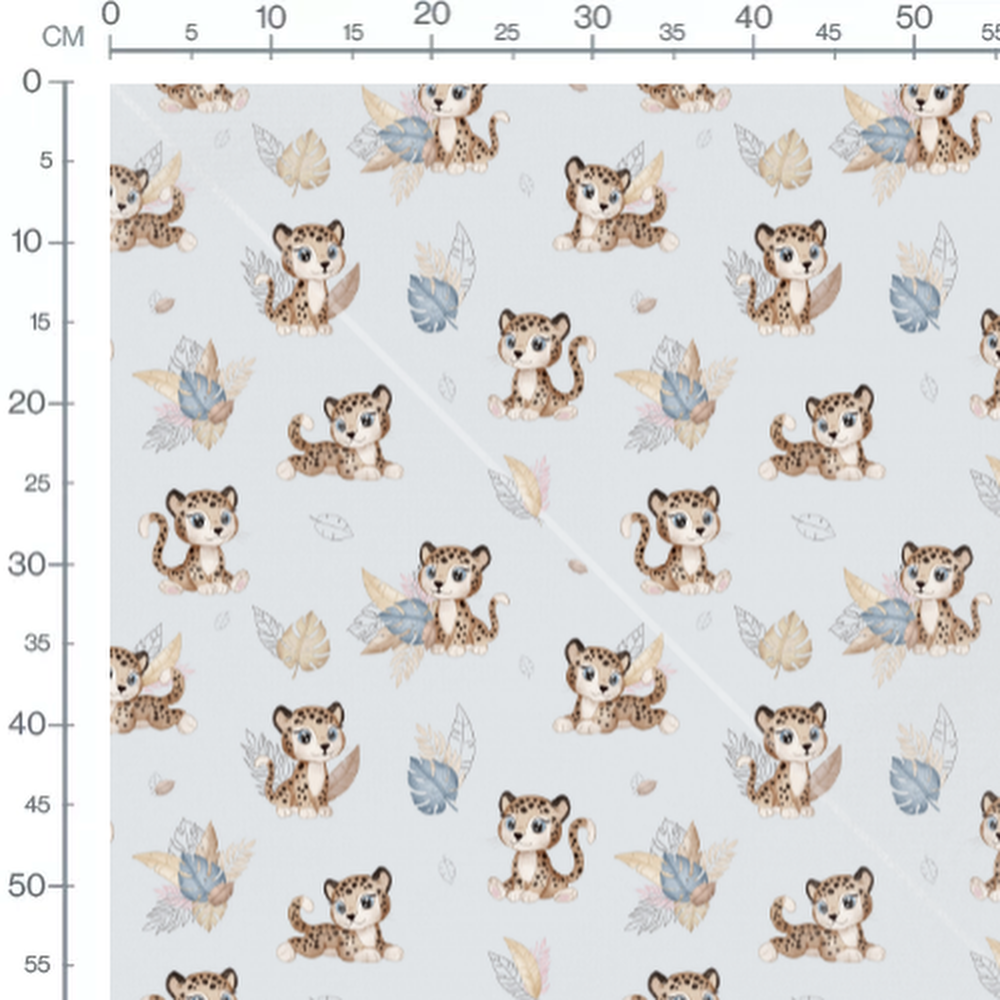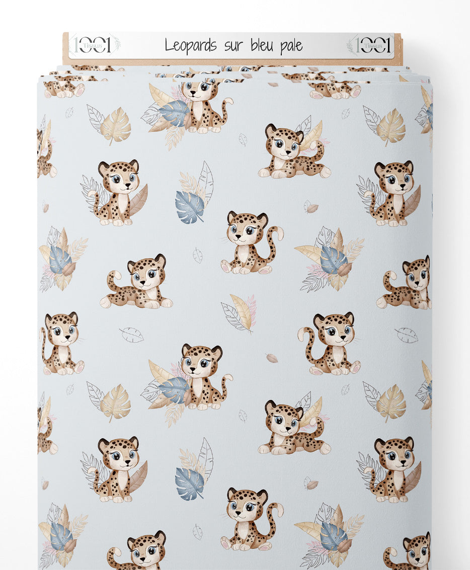 Les léopards ont des taches noires et des expressions amicales. Les feuilles varient en taille et en couleur, ajoutant une touche naturelle au motif.Les tissus