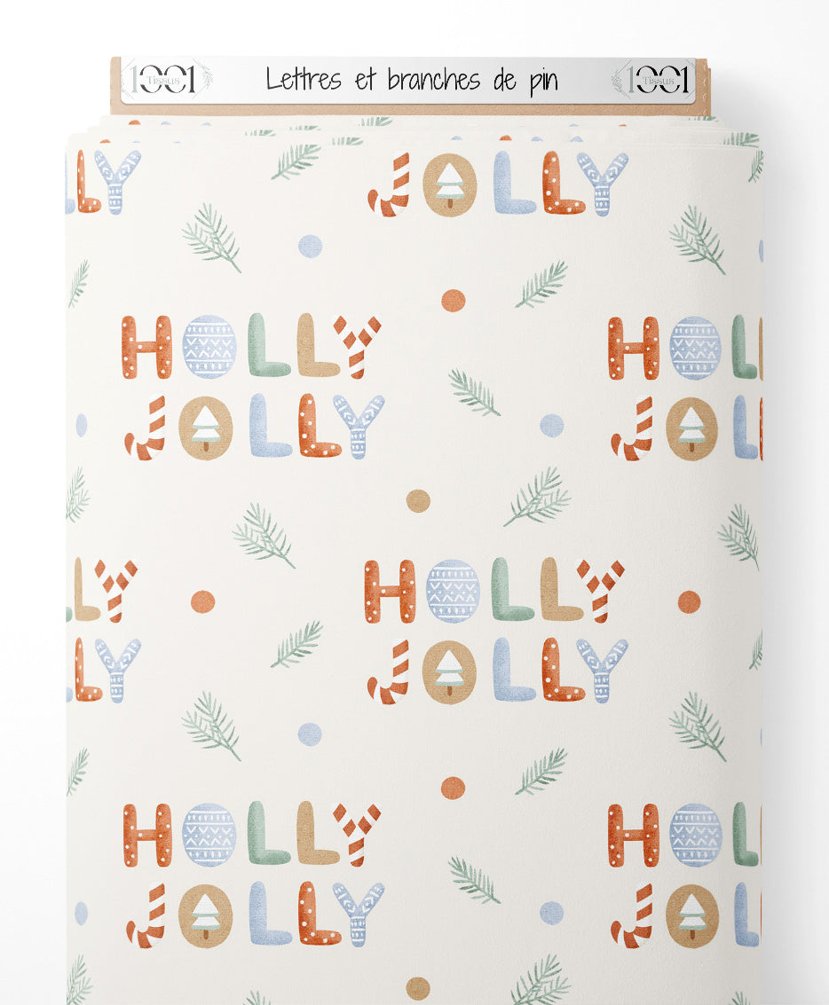 Les lettres sont décorées de motifs hivernaux et de couleurs variées. Les branches de pin ajoutent une touche naturelle au design. Des points de différentes couleurs apportent une dimension ludique.Les tissus