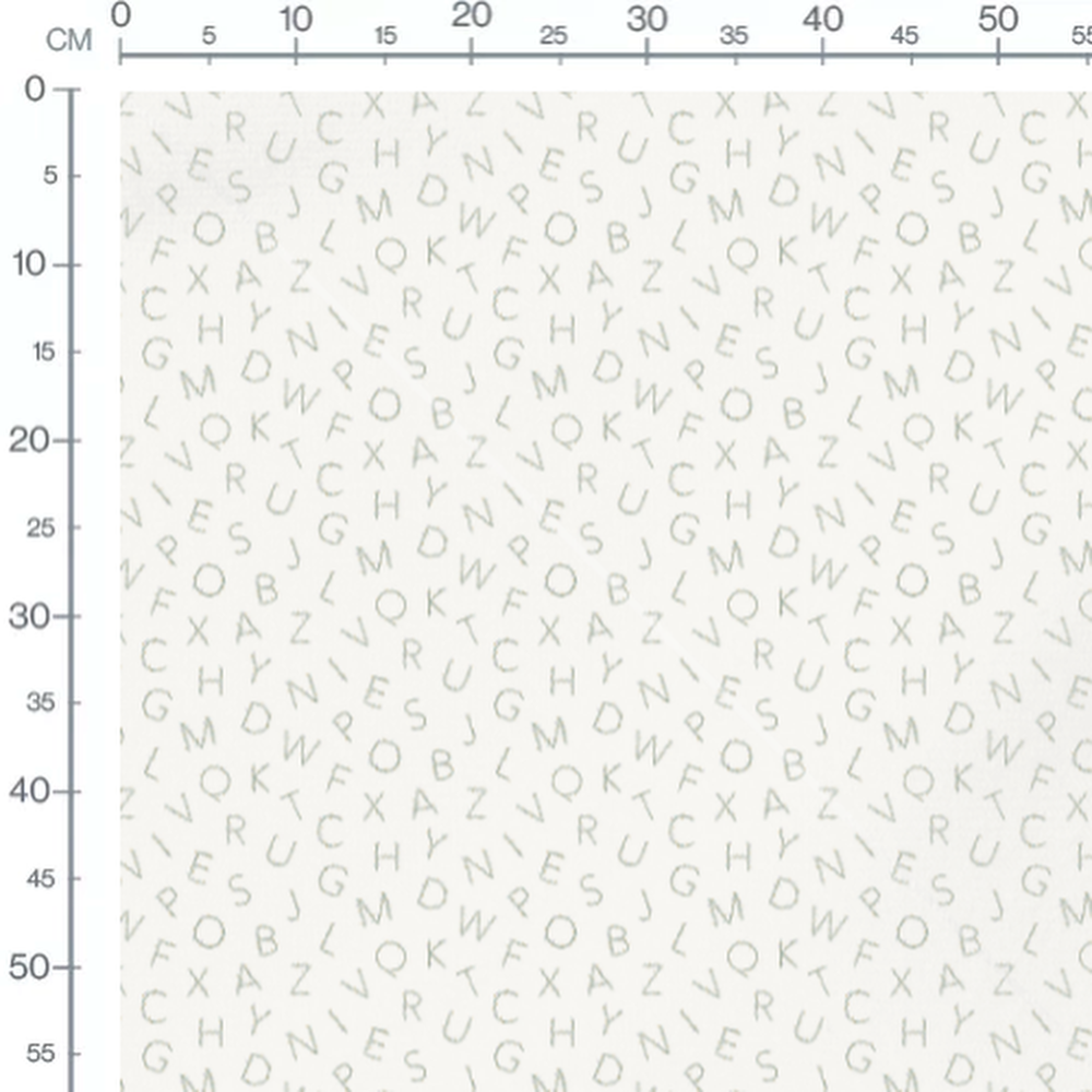 Chaque lettre est composée de petites feuilles vertes. Le fond blanc met en valeur les lettres feuillues. Les lettres sont de tailles variées.Les tissus