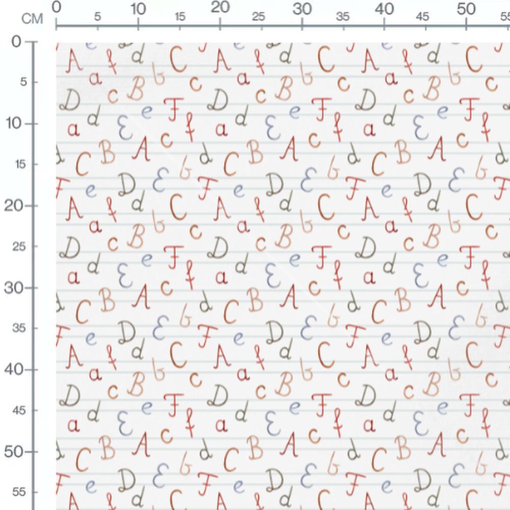 Les lettres sont dispersées de manière aléatoire sur le fond. Chaque lettre est dessinée dans une couleur différente, ajoutant une touche ludique et éducative. Le fond ligné rappelle une page de cahier d'écolier.Les tissus