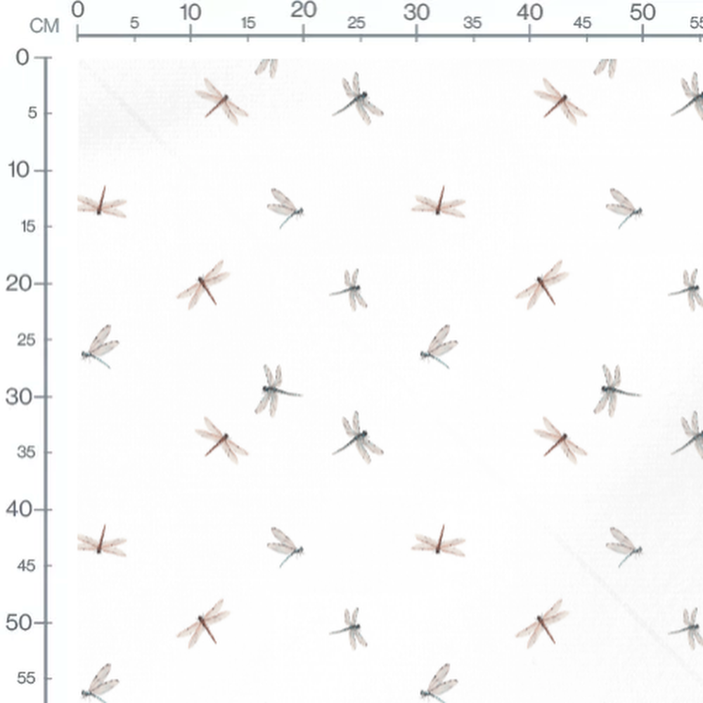 Les libellules sont dessinées avec des détails fins et des nuances douces. Leurs ailes sont légèrement teintées de rose et de gris. Chaque libellule est unique par la position de ses ailes et la couleur de son corps.Les tissus