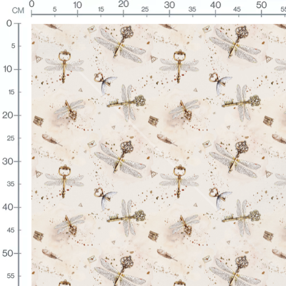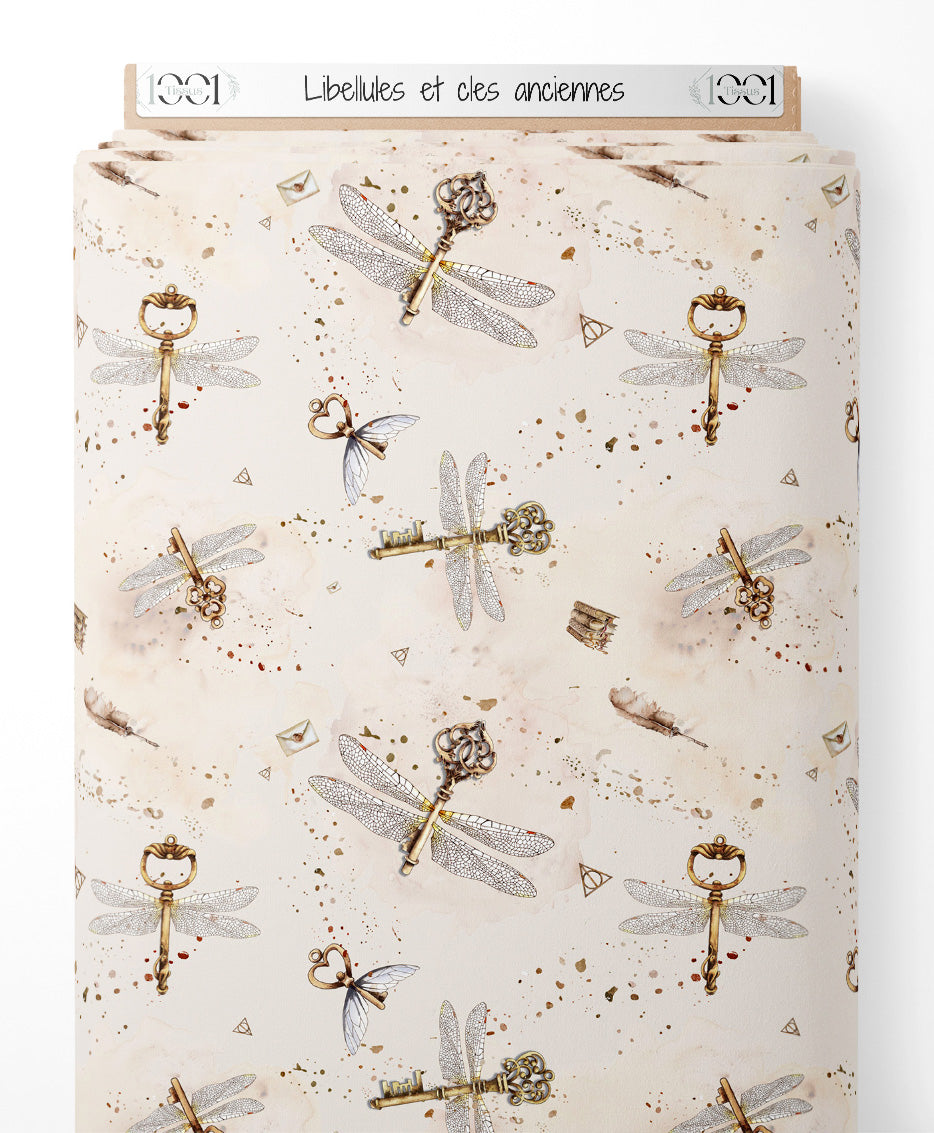 Les libellules ont des ailes finement dessinées et sont associées à des clés de style ancien. Le fond beige est parsemé de petites formes géométriques et de taches brunes, ajoutant une touche artistique.Les tissus