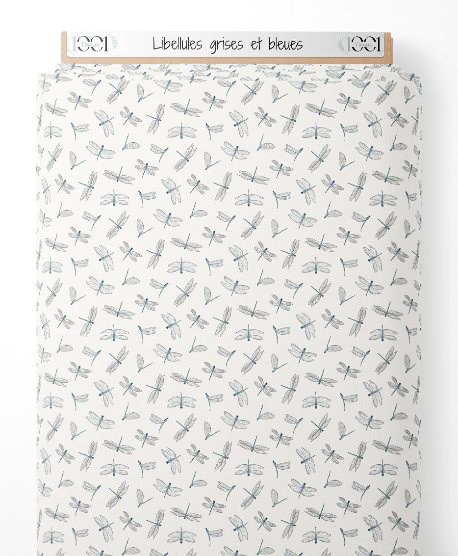 Les libellules sont dessinées avec des détails fins et des nuances de gris et de bleu. Le fond blanc met en valeur la légèreté des insectes. Chaque libellule est unique par ses nuances subtiles.Les tissus