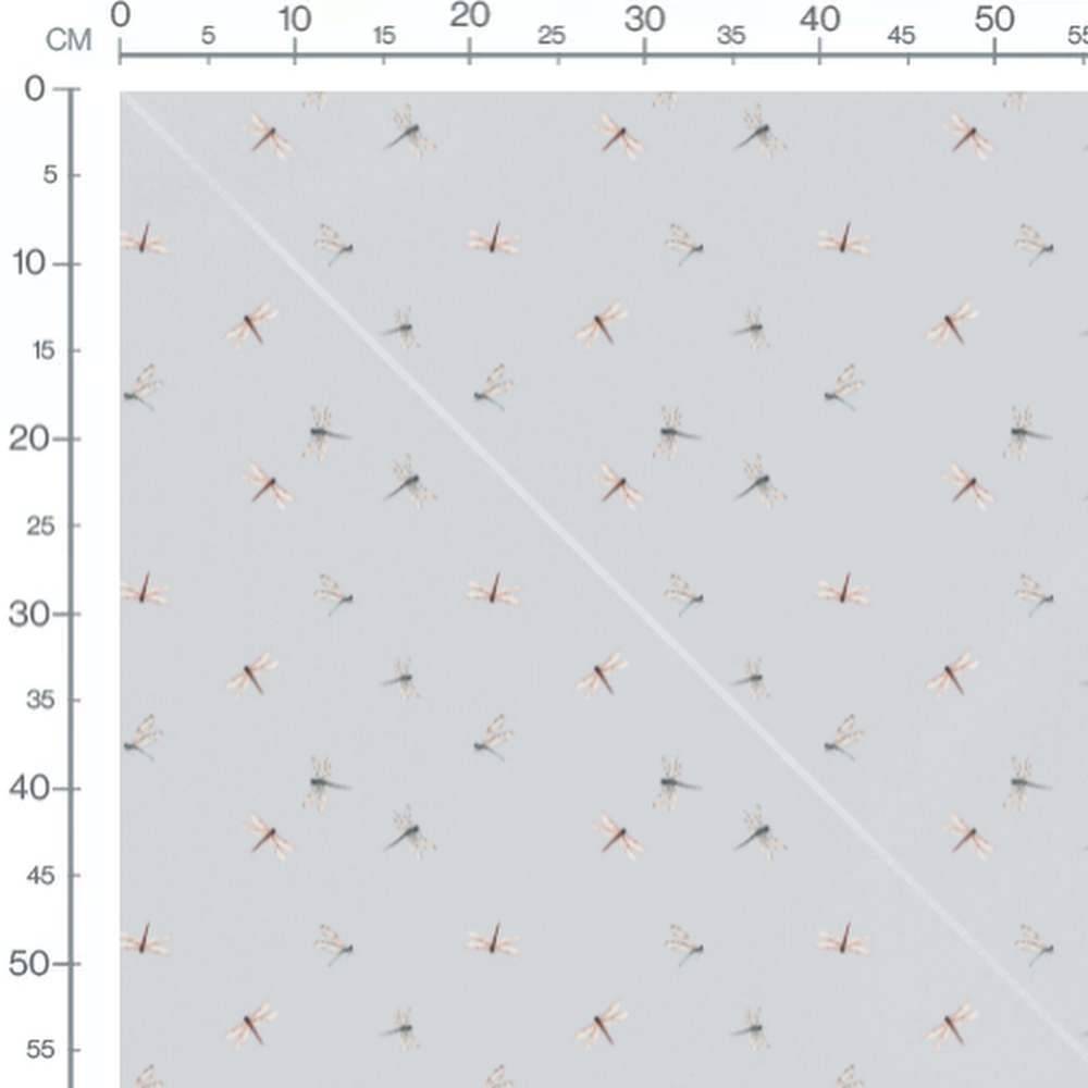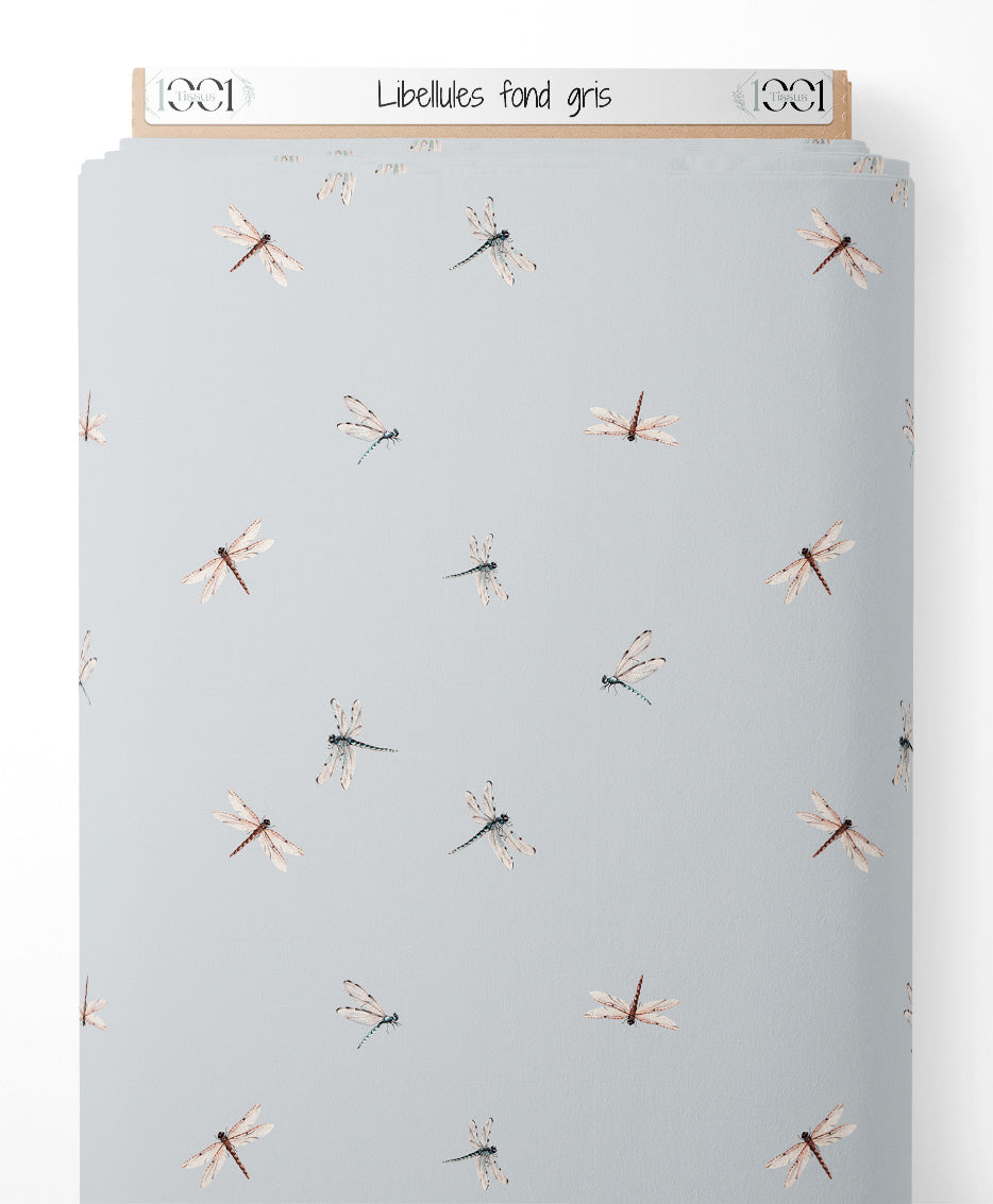 Les libellules sont illustrées avec des ailes légèrement teintées de beige. Le fond gris clair met en valeur les détails des insectes.Les tissus