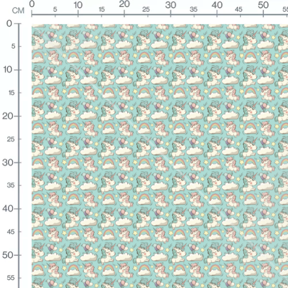 Les licornes ont des crinières roses et bleues. Des ballons colorés flottent au-dessus des nuages. Les arcs-en-ciel ajoutent une touche de couleur vive.Les tissus