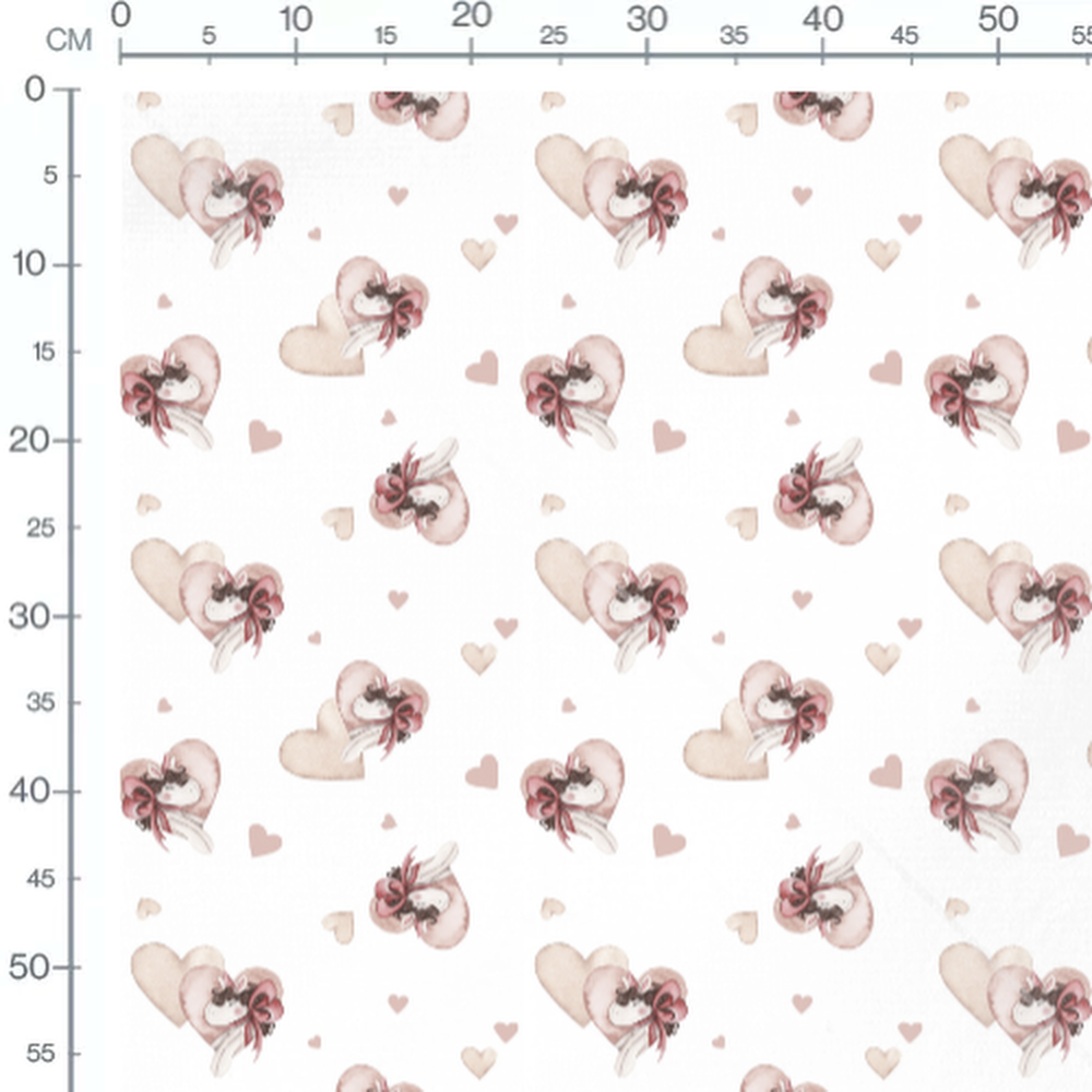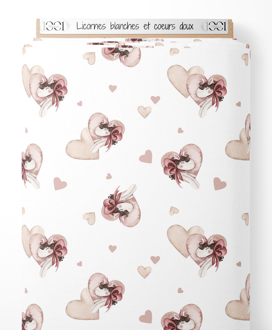 Les licornes ont des crinières bouclées et des rubans roses. Les cœurs varient en taille et en teinte, ajoutant une touche douce au motif.Les tissus