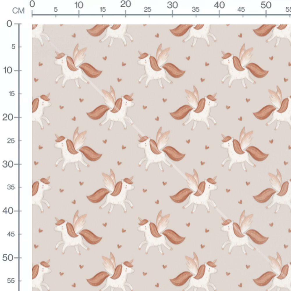 Les licornes ont des ailes délicates et des cornes pointues. Leurs crinières et queues sont d'un brun doux. Les petits cœurs ajoutent une touche de charme au motif.Les tissus