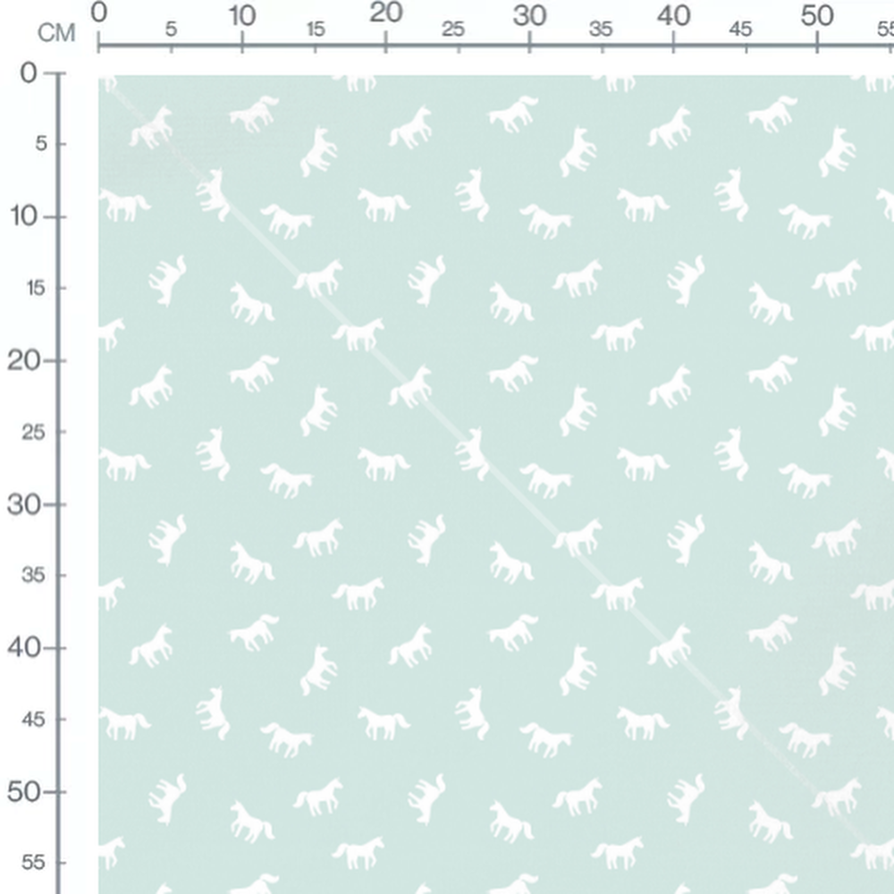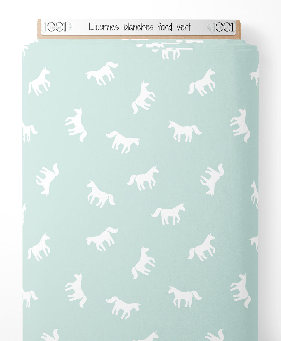 Les licornes sont représentées en blanc sur un fond vert pastel. Le motif est simple et répétitif, mettant en avant la forme iconique des licornes.Les tissus