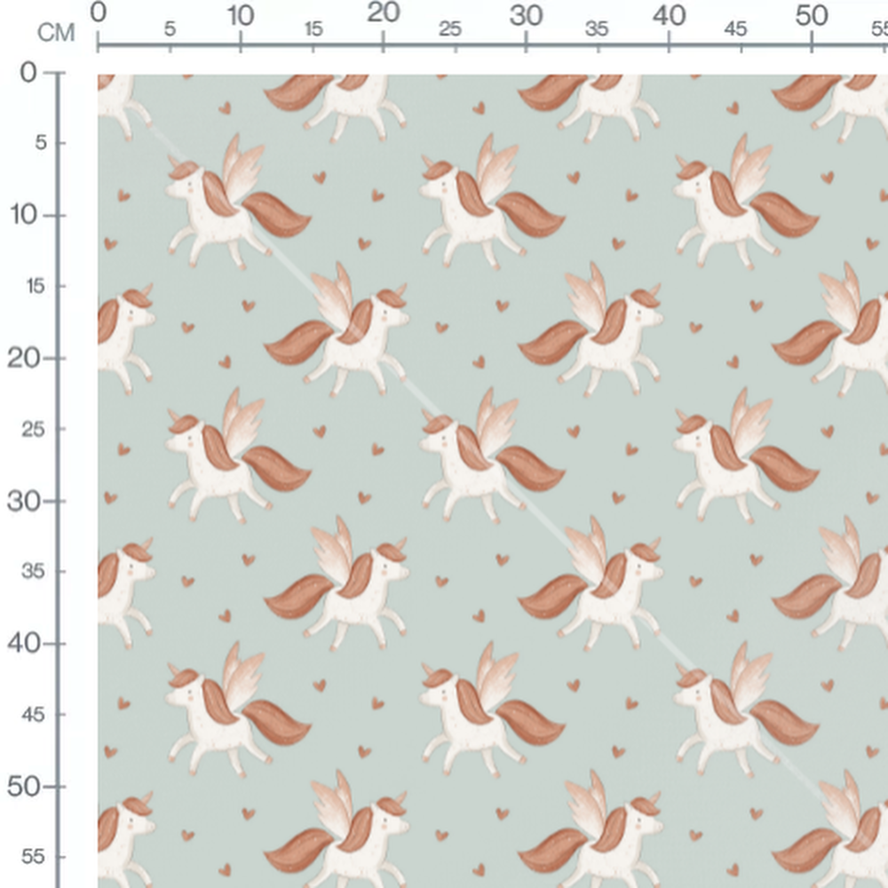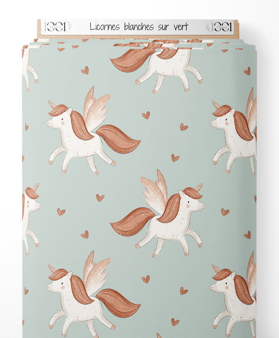 Les licornes ont des ailes légèrement scintillantes. Les cœurs ajoutent une touche de douceur au motif.Les tissus