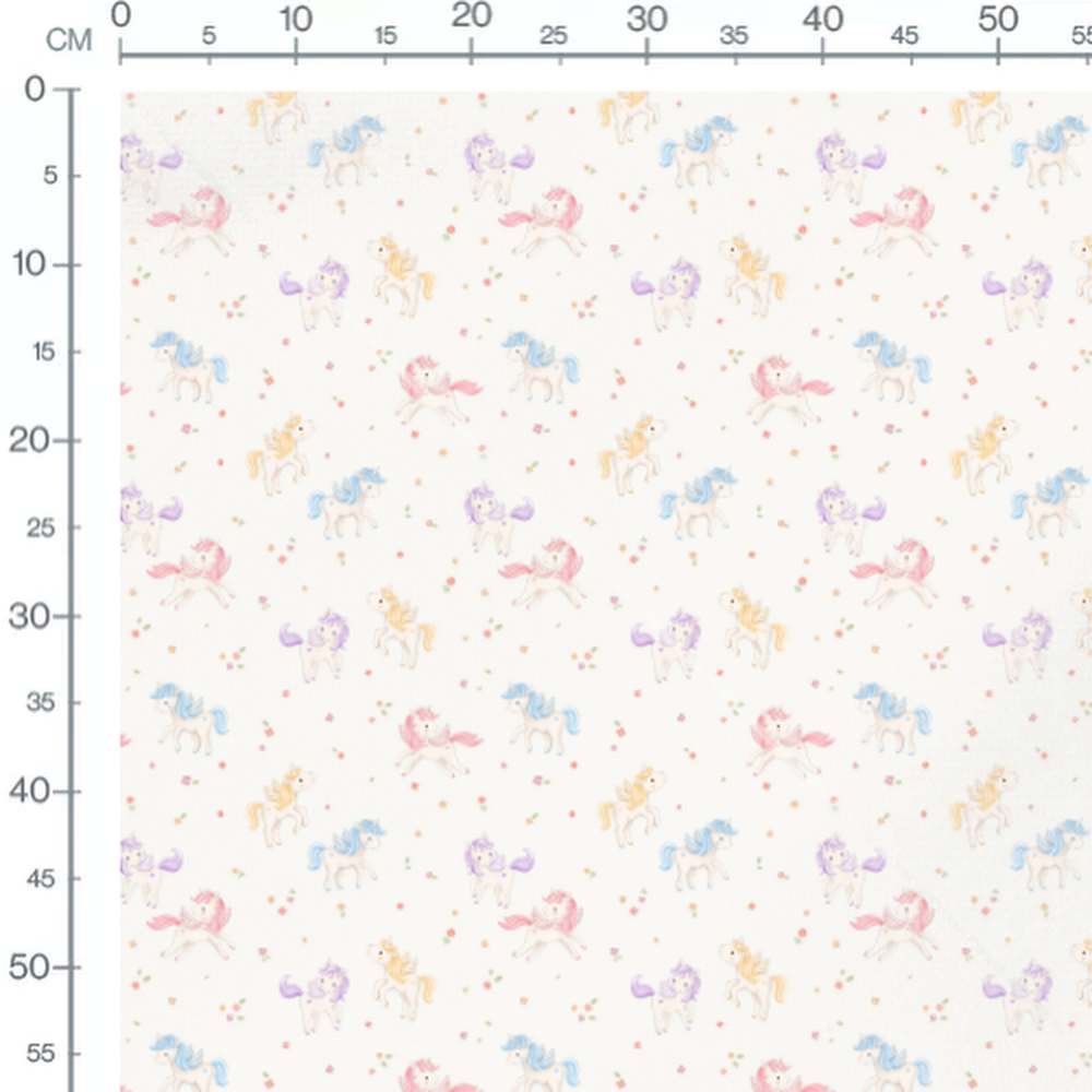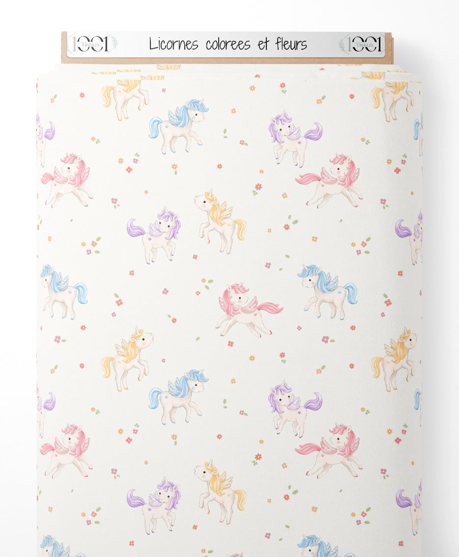 Les licornes ont des ailes et des crinières colorées. Des fleurs rouges, oranges et roses ajoutent une touche de couleur. Quelques feuilles vertes sont également présentes.Les tissus