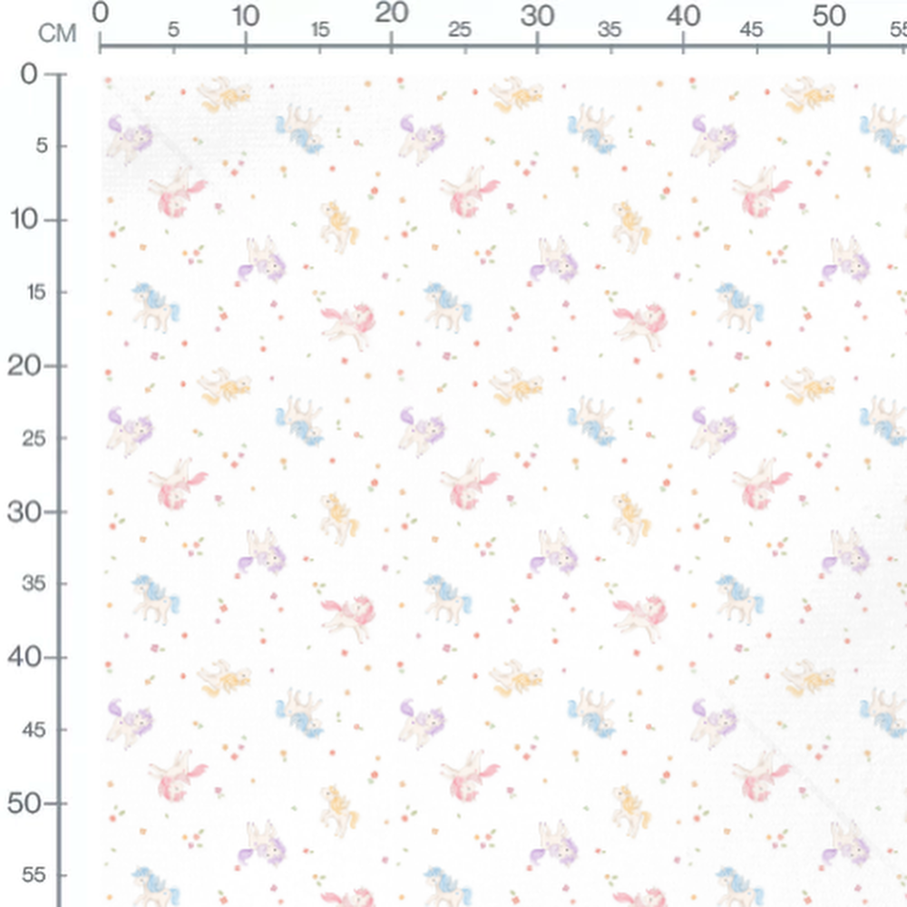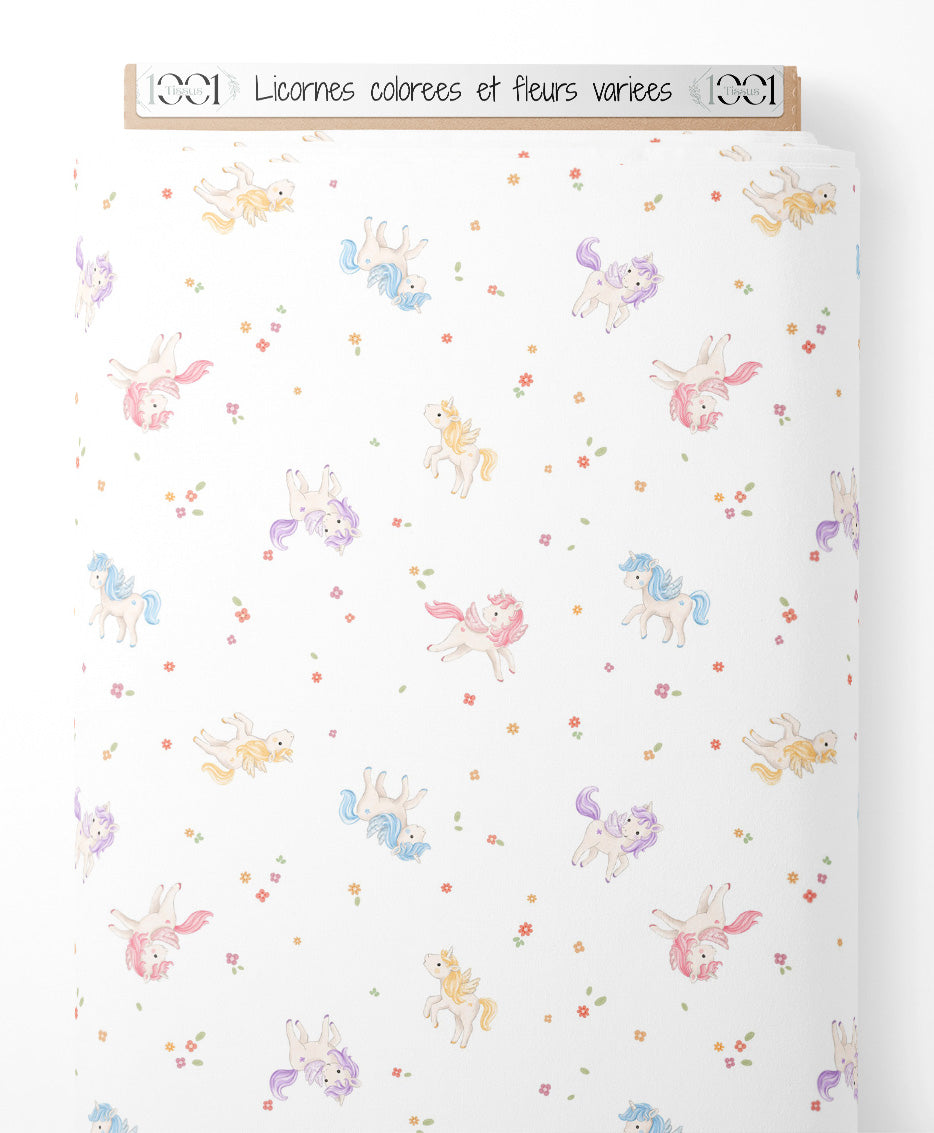 Les licornes ont des crinières de couleurs pastel comme rose, bleu et jaune. Les fleurs sont de différentes couleurs, ajoutant une touche de douceur. De petites feuilles vertes complètent le motif.Les tissus