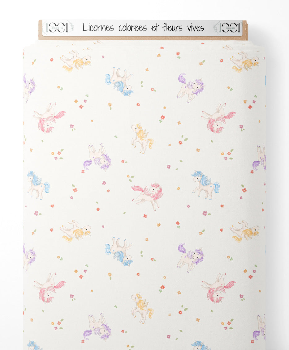 Tissu - Licornes colorées et fleurs vives