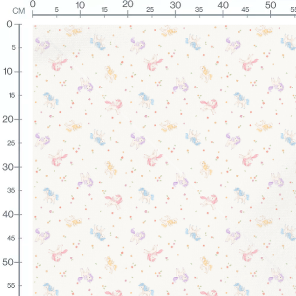 Les licornes ont des crinières de couleurs pastel comme rose, bleu et violet. De petites fleurs rouges, jaunes et oranges sont éparpillées autour des licornes. Le fond blanc met en valeur les couleurs douces des motifs.Les tissus