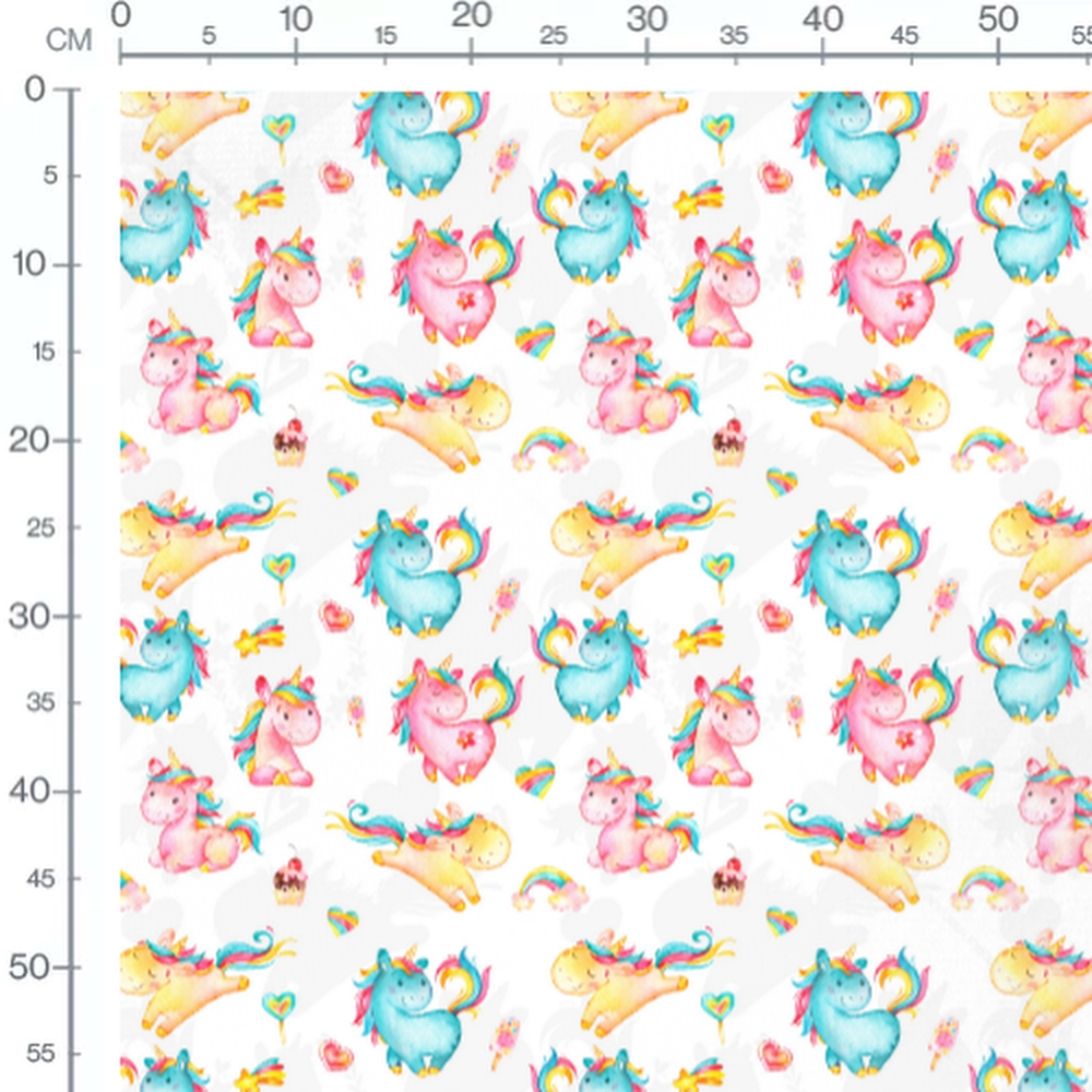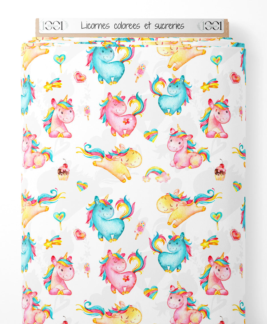 Les licornes arborent des crinières arc-en-ciel. Des étoiles et des sucettes complètent le motif joyeux.Les tissus