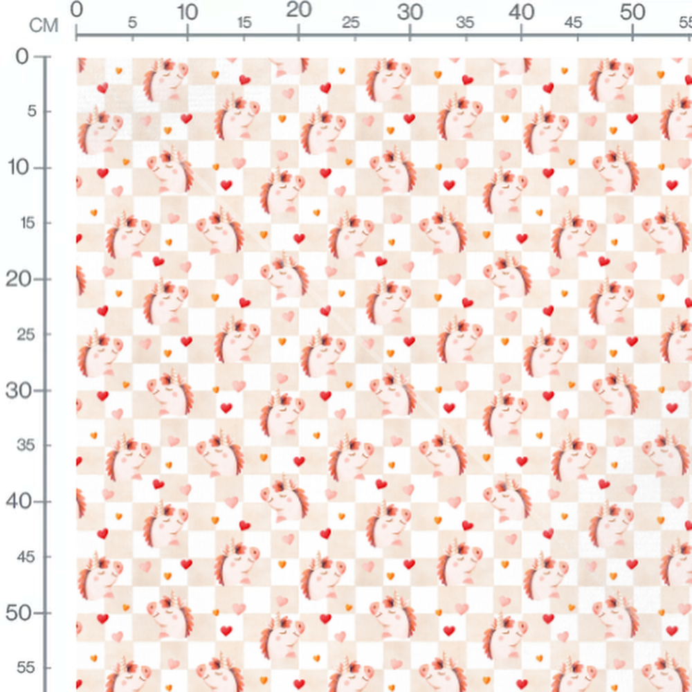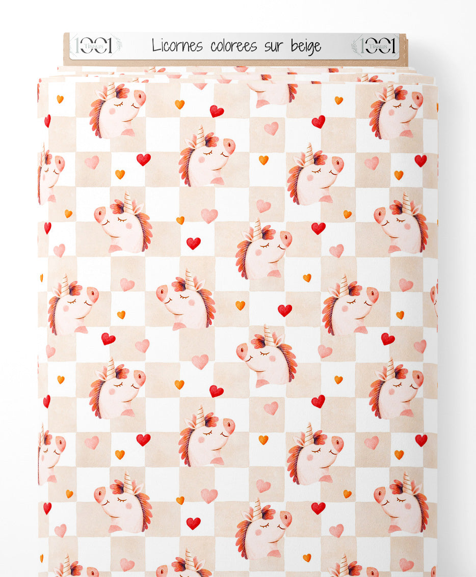 Les licornes ont une expression paisible et des cornes rayées. Les cœurs ajoutent une touche de couleur vive au motif. Le fond à carreaux beige crée un contraste doux avec les éléments colorés.Les tissus