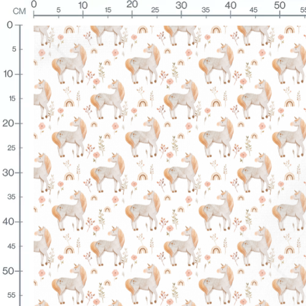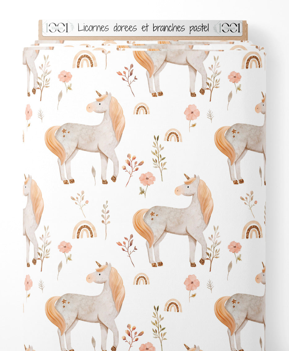 Les licornes arborent des crinières dorées et des sabots scintillants. Des fleurs délicates et des arcs-en-ciel ajoutent une touche de couleur pastel. Des feuilles et des branches complètent le motif féerique.Les tissus