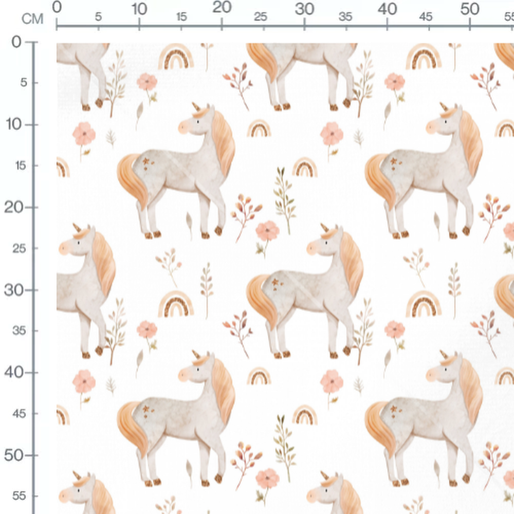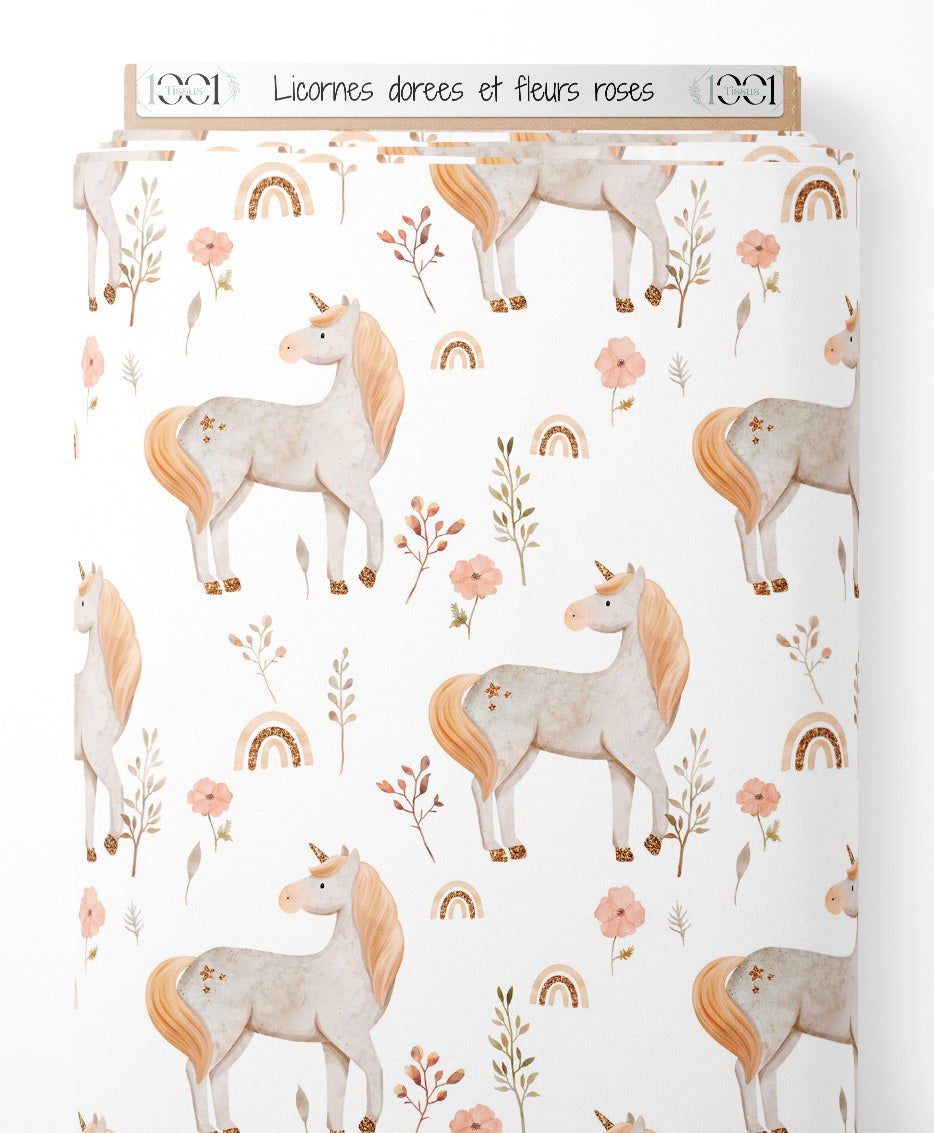Les licornes arborent des crinières et des queues dorées. Des fleurs délicates et des arcs-en-ciel ajoutent une touche de couleur douce.Les tissus