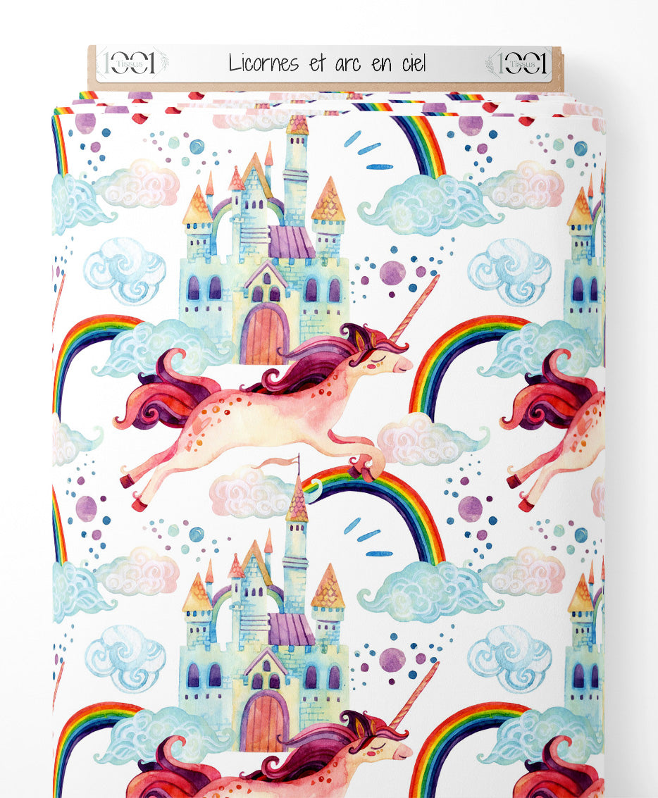Les licornes ont des crinières ondulées et des couleurs vives. Les châteaux sont ornés de tours et de toits colorés. Les arcs-en-ciel ajoutent une touche de couleur vive. Les nuages sont dessinés dans des tons doux et pastels.Les tissus
