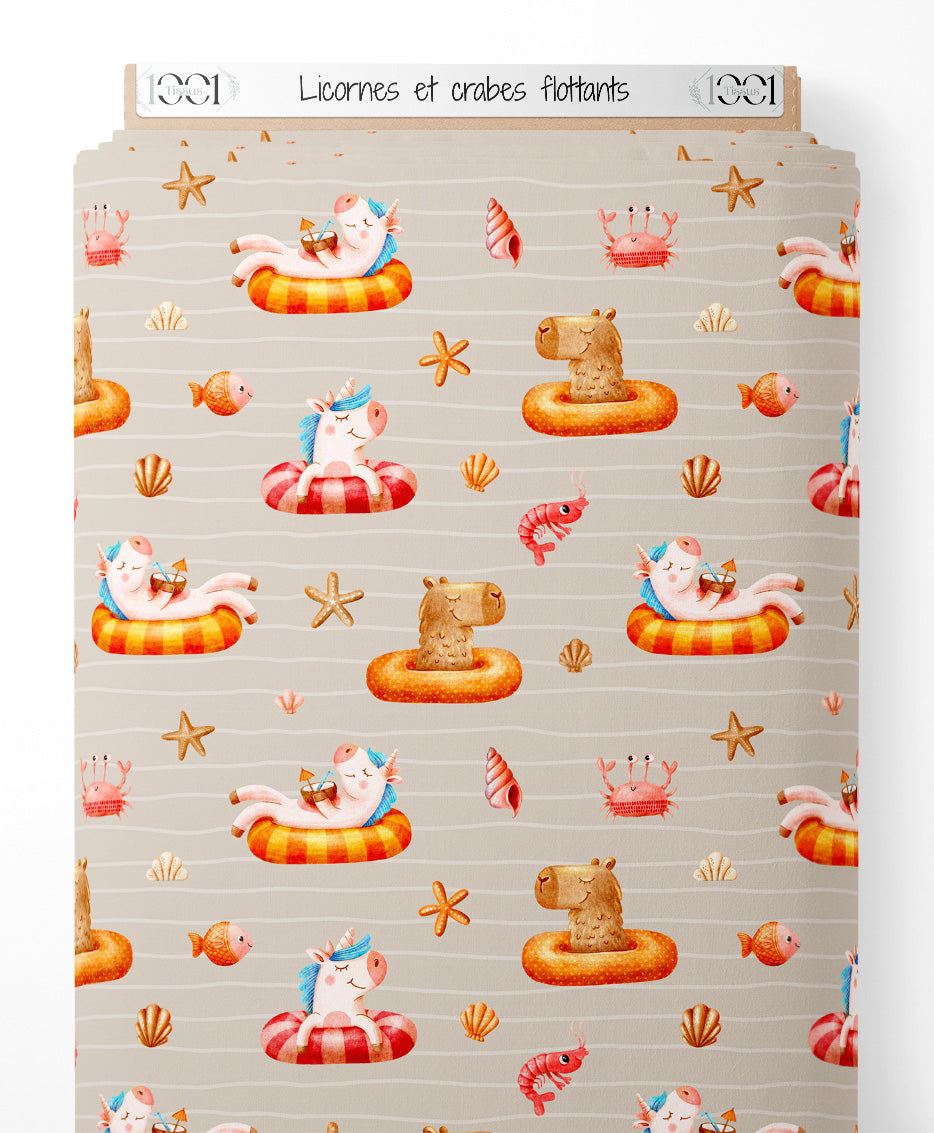 Les licornes sont allongées sur des bouées rayées rouges et oranges. Des crabes et des poissons nagent autour des bouées. Des coquillages et des étoiles de mer ajoutent des détails marins au motif.Les tissus