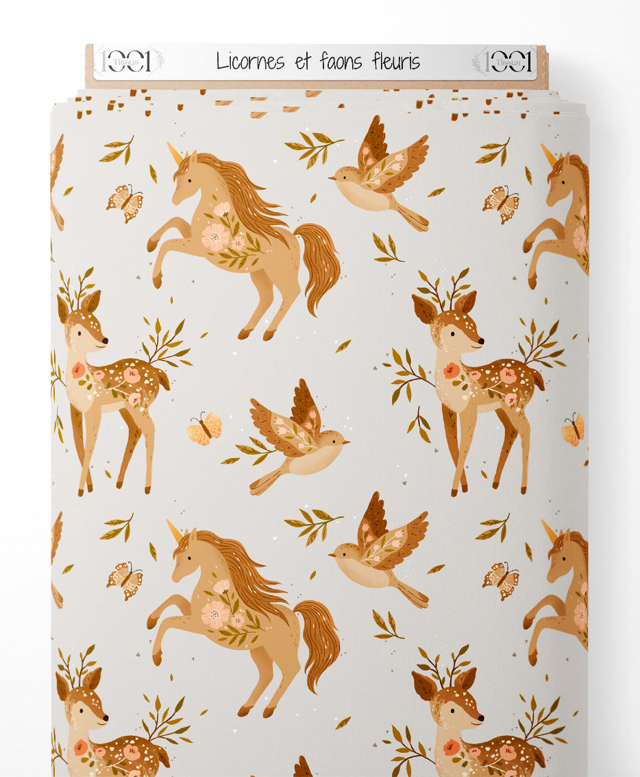 Tissu - Licornes et faons fleuris
