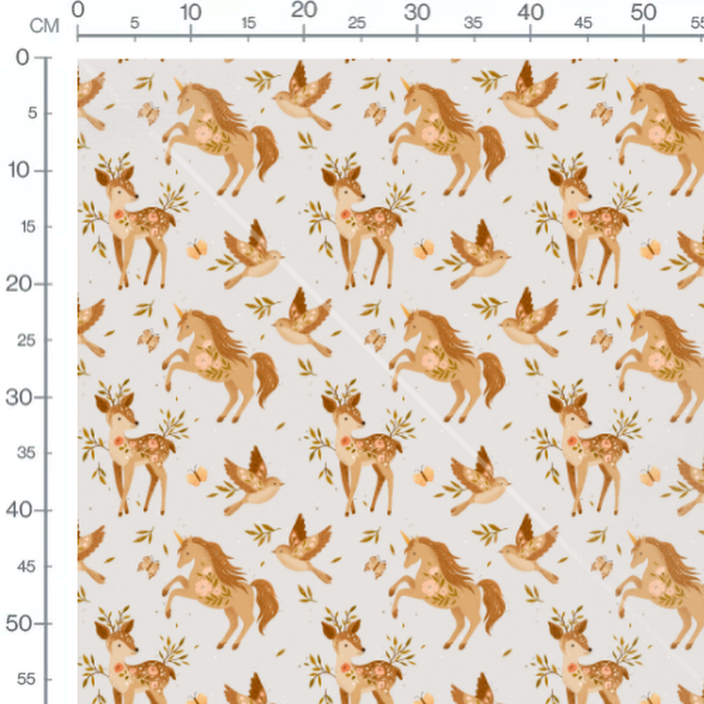 Les licornes sont ornées de motifs floraux délicats. Les faons présentent des détails floraux similaires. Des oiseaux aux ailes déployées et des papillons complètent le motif.Les tissus