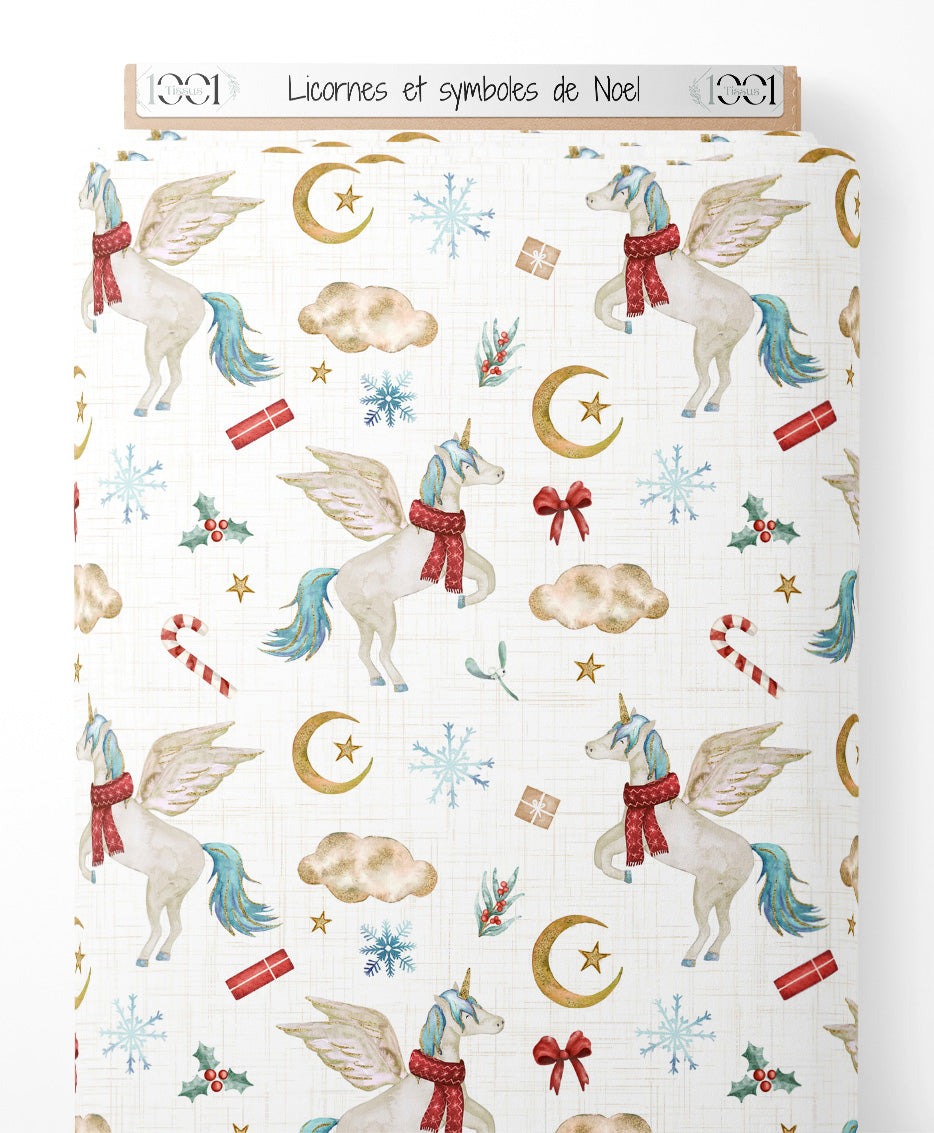 Les licornes portent des écharpes rouges et ont des ailes dorées. Des flocons de neige bleus et des lunes dorées décorent le fond. Des étoiles dorées et des nuages beige clair sont dispersés. Des cadeaux rouges et des cannes à sucre complètent le motif festif.Les tissus