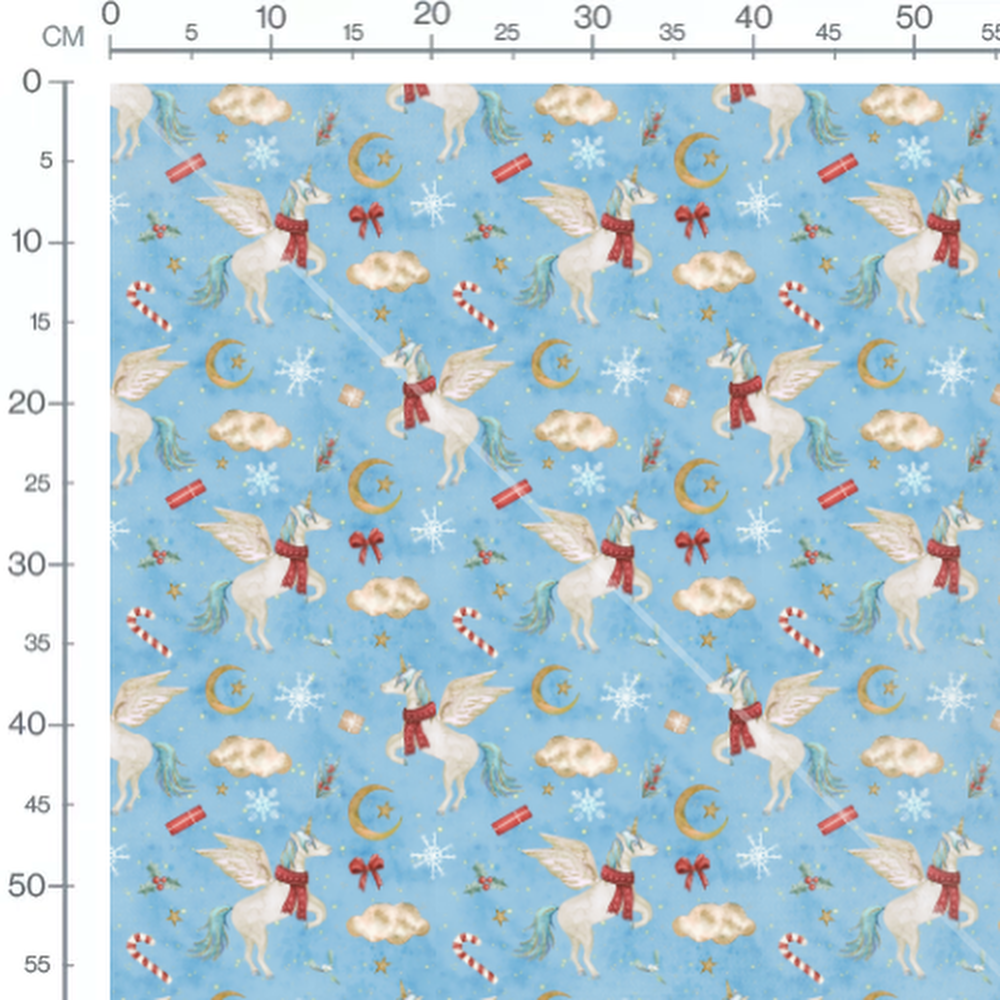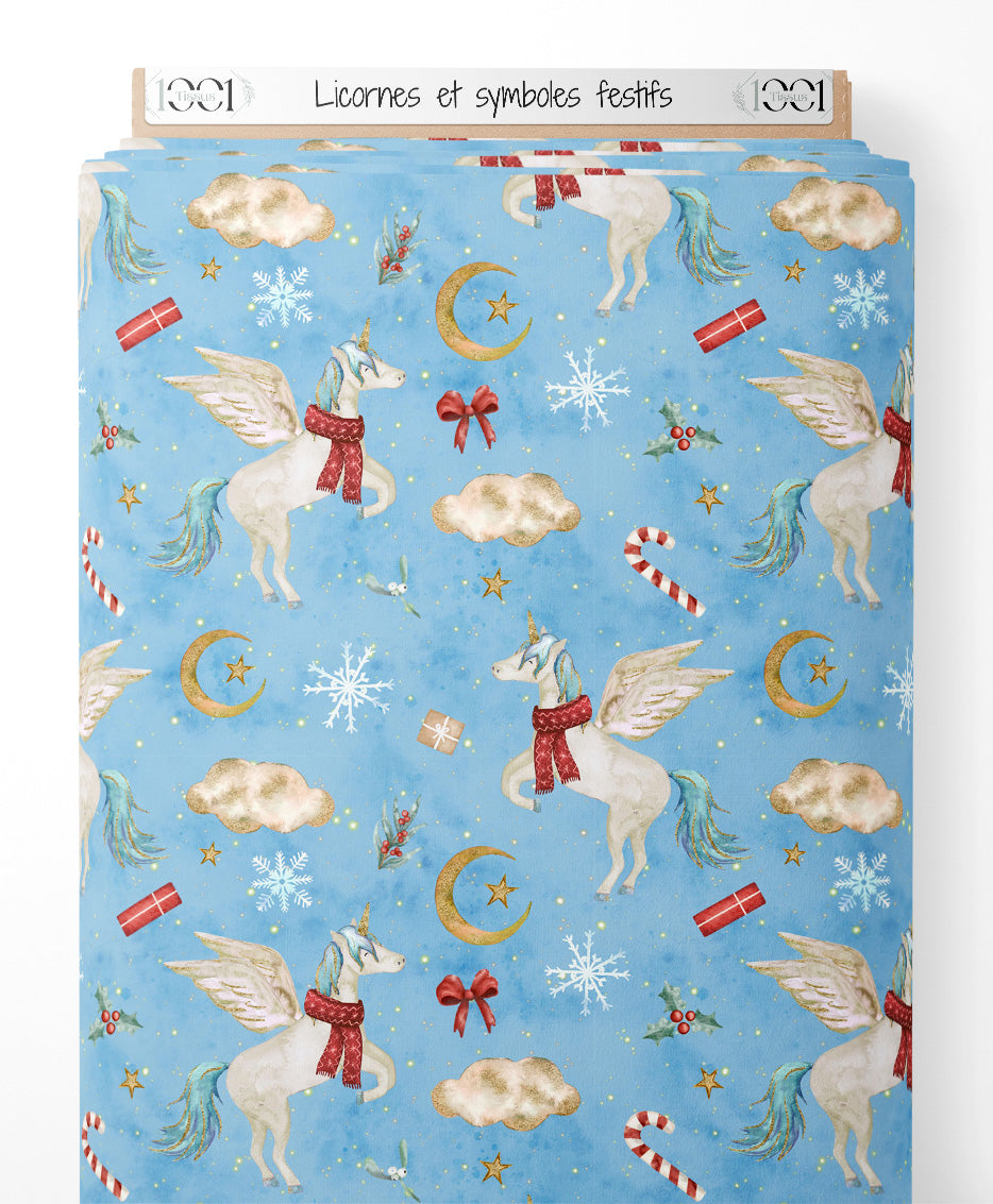 Les licornes portent des écharpes rouges et ont des ailes dorées. Des nuages dorés et des lunes dorées parsèment le fond bleu. Des flocons de neige blancs et des cadeaux rouges et dorés complètent le motif. Des étoiles dorées et des cannes à sucre rouges et blanches ajoutent une touche festive.Les tissus