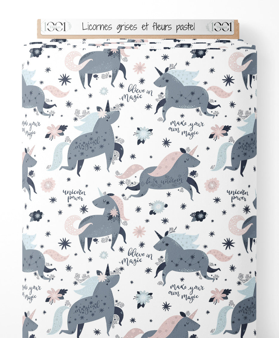 Les licornes sont ornées de motifs étoilés. Des fleurs et des inscriptions ajoutent une touche magique. Les couleurs pastel créent une ambiance douce et féerique.Les tissus