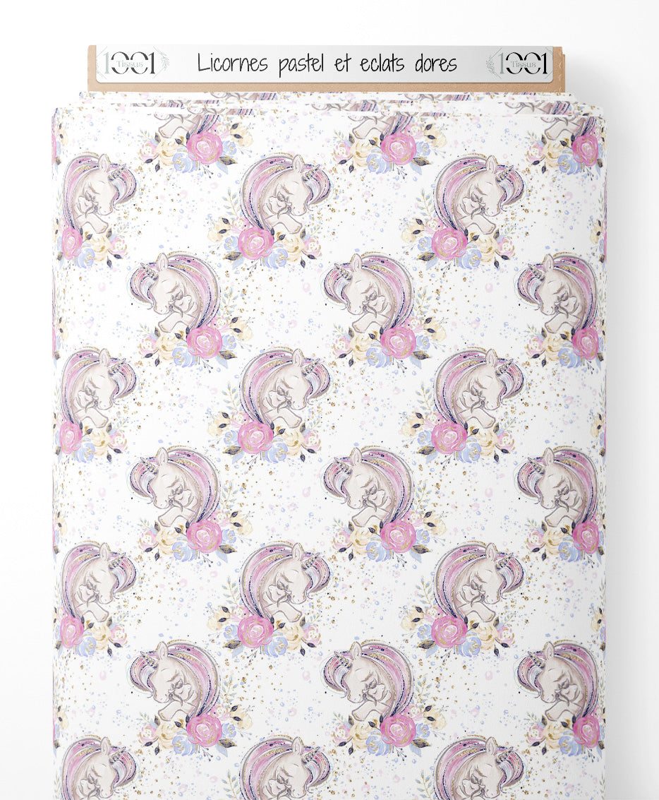 Les licornes arborent des crinières aux teintes douces de rose et de violet. Les fleurs qui les entourent sont principalement roses et bleues, ajoutant une touche florale délicate. De petits éclats dorés sont éparpillés, apportant une touche scintillante au motif.Les tissus