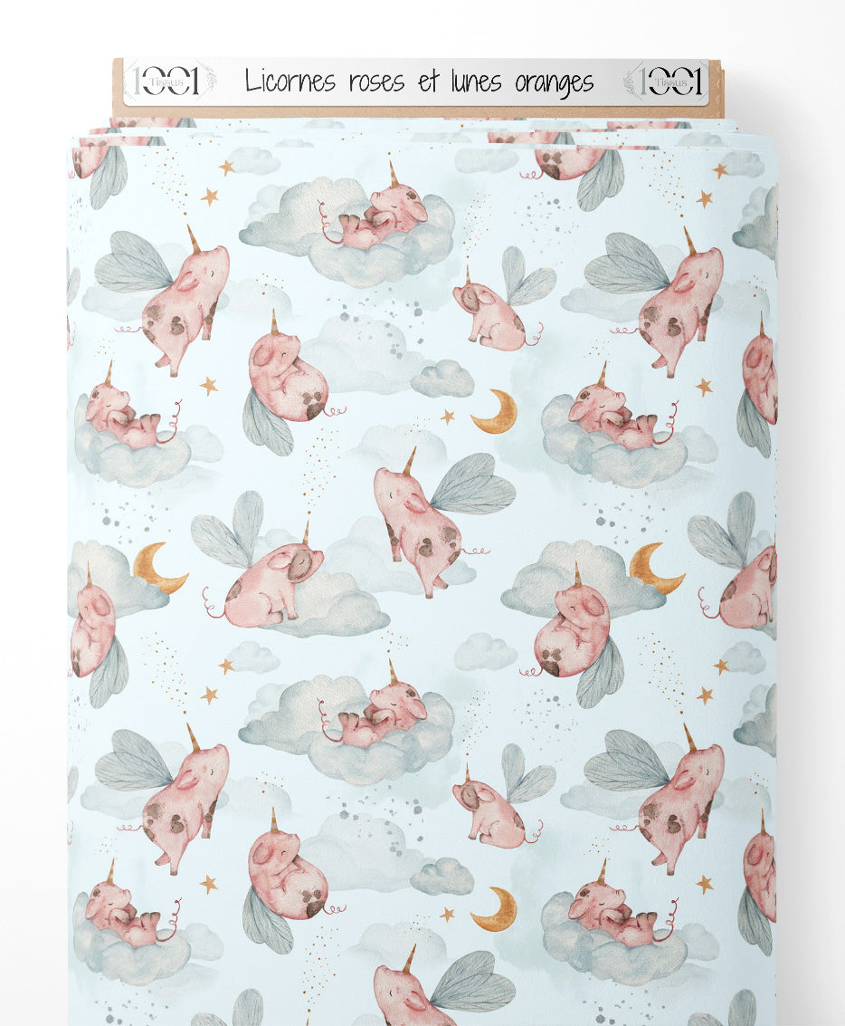 Les licornes roses ont des ailes et des cornes dorées. Elles sont entourées de nuages doux et moelleux. Des étoiles dorées et des lunes oranges ajoutent une touche magique au motif.Les tissus